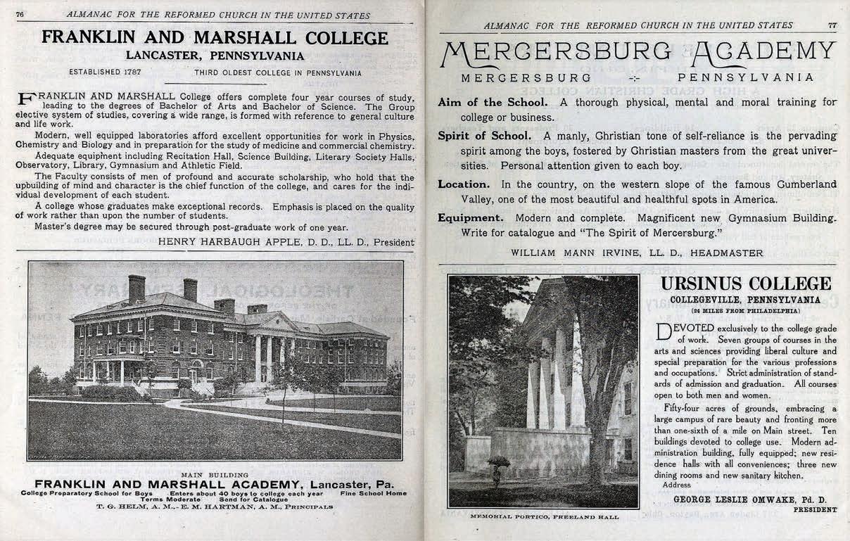 MERCERSBURG TODAY The seminary at Mercersburg experienced a number of physical transitions. Lancaster Theological Seminary (above) continues its spiritual legacy. You can also find Mercersburg resources at other academic institutions influenced by Mercersburg thinkers, such as Franklin and Marshall College (above right), where John Nevin served as president.