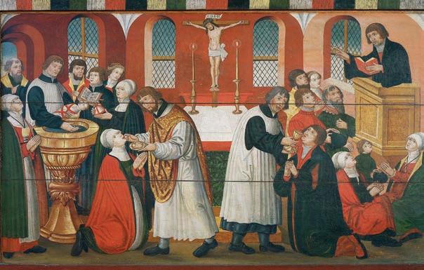 ELEVATING THE MYSTICAL PRESENCE Mercersburg theology emphasized the sacraments, especially the Lord’s Supper (imagined in this 17th-c. painting at left).