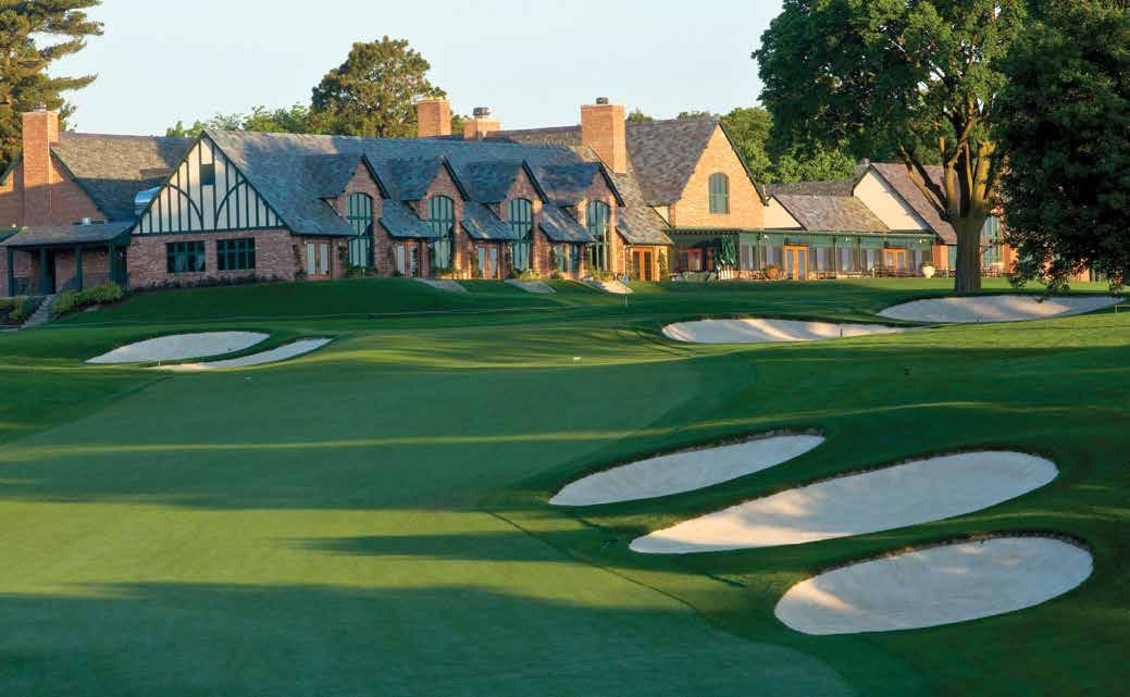 The ninth hole at Omaha Country Club provides a look at several of the club’s features — its forested and hilly terrain and its stately Tudor clubhouse.