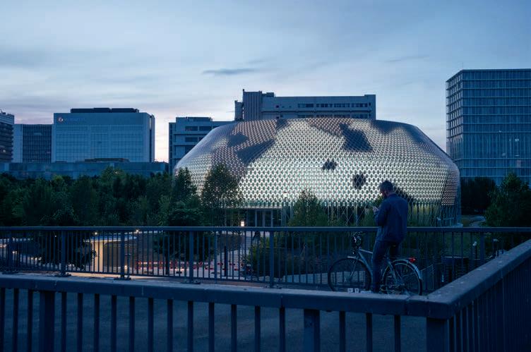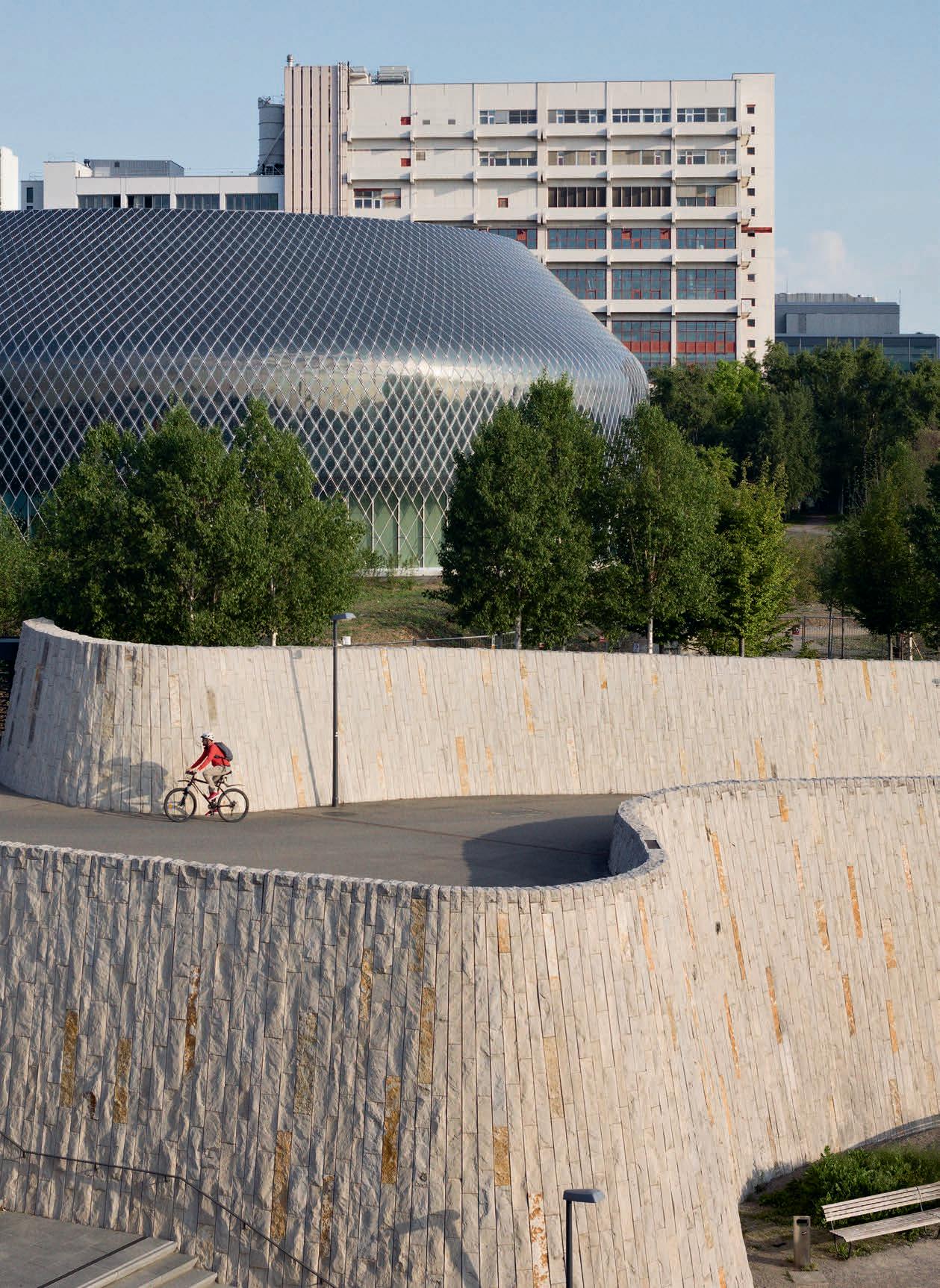 Theroundform,ontheotherhand,isnovelwithinthecanonofbuildingsontheNovartisCampus.Thepavilion radiatesthatitdoesnotneedtobeefficientorstandardizedlikealaboratorybuilding.Here,communicationstands atthecenter.ForAMDLCircle&MicheleDeLucchi,thebuildingisacircleoflearning.Theimageofscholarsmaking theirrounds,theirhandsbehindtheirbacks,appearstothemind’seye.Butitisnotintendedtobegruelingwork; thankstonewandspecificallydevelopedtechnologyusedintheNovartisPavillon,learningbecomeslighthearted.