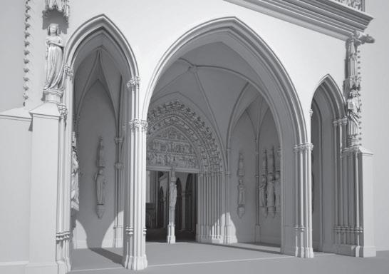 Die Rekonstruktion zeigt, dass das Kaiserpaar dort aussen vorne links und rechts stand. An der linken und rechten Innenwand der Vorhalle befanden sich – zusammen mit weiteren Figuren – die Statuen von fünf klugen und fünf törichten Jungfrauen. Zu Seiten des Eingangs war die Statue des Verführers mit einer Christusstatue kombiniert. Da die Verführerstatue damals etwa auf Augenhöhe stand, konnte im Gegensatz zu heute der Rücken gut eingesehen werden.