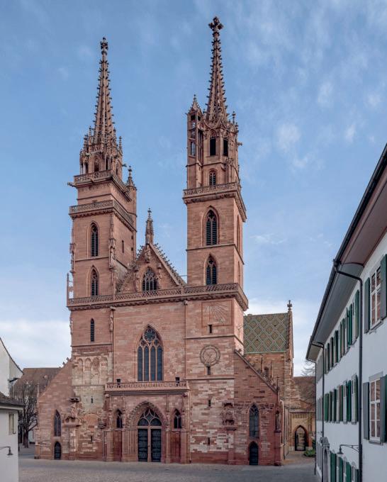 Das Münster und der Münsterplatz bilden eine Einheit. Der weite Platz setzt den o enen Stadtraum gegen die relative Beständigkeit des Bauwerks. Relativ, denn heute steht hier bereits der vierte Münsterbau! Er trägt überall Spuren seiner drei Vorgängerbauten in sich. Diesen werden wir im Laufe des Rundgangs immer wieder begegnen. Das erste Münster errichtete ein Vertrauter Kaiser Karls des Grossen. Er hiess Haito, war Abt des Klosters Reichenau auf der gleichnamigen Insel im Bodensee und von 805 bis 823 Bischof von Basel. In dieser Zeit legte er den Grundstein des Münsters. Das karolingische Haitomünster wurde jedoch bereits gut zwei Jahrhunderte später umfassend erneuert. Auf seinen Fundamenten kam das zweite, das sogenannte Heinrichsmünster zu stehen, das 1019 von Kaiser Heinrich II. eingeweiht wurde. Um 1170 bis 1230 folgte dann das dritte, spätromanische Münster, dessen fünf Türme bei einem grossen Erdbeben im Jahr 1356 zerstört wurden. Wiederaufgebaut und fertiggestellt wurden später nur noch zwei Türme: 1429 der sogenannte Georgsturm (links), 1500 der Martinsturm (rechts). Die Fertigstellung des Martinsturms gilt auch als Schlusspunkt der Erbauung des vierten, spätgotischen Münsters. Es entspricht in seinen Grundzügen der heutigen Gestalt. Nochmals grosse Veränderungen,