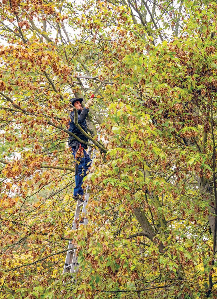 Arbeit im Grünen: Baumpfleger Danijar Rohner beim Schneiden einer Hagebuche –einem von über 1100 Bäumen im Zoo Basel.