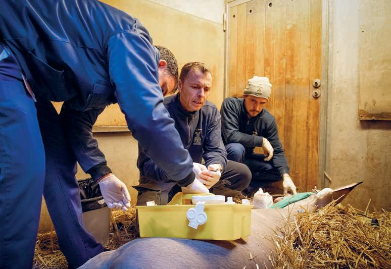 ‹Salia› liegt nach wie vor tief schlafend im Stroh und das Tierärzte-Team macht letzte Untersuchungen. Dann wird sie von Tierpflegern auf einer Schleppmatte vorsichtig in den Anhänger getragen. Dort spritzt ihr Zootierärztin Fabia Wyss ein Gegenmittel, und nach wenigen Minuten steht die Stute wieder auf den Beinen. Sie auf dem Transport einfach durchschlafen zu lassen, ist keine Option, denn eine lange Narkose ohne Überwachung wäre zu risikobehaftet. Damit ‹Salia› die Reise im Wachzustand gut übersteht, haben ihr die Tierärzte zwei Tage vor dem Transport ebenfalls per Blasrohr ein Beruhigungsmittel gespritzt, das jetzt seine volle Wirkung entfaltet. Es erleichtert dem Wildtier später zudem die Eingewöhnung in der neuen Umgebung und klingt nach vierzehn Tagen wieder ab. ‹Salia› scharrt im Anhänger und wird allmählich ungeduldig. Es ist das Zeichen, dass sie ganz wach ist und der Transport losgehen kann. Der Fahrer steigt in den Lastwagen und fährt über die engen Zoowege in Richtung Ausgang. Alfredo García greift zum Telefon und informiert das kantonale Veterinäramt und den Zoll, dass der Transport unterwegs ist. Die Tore des Zoos gehen auf und der Lastwagen rollt hinaus. Gute Reise, ‹Salia›!