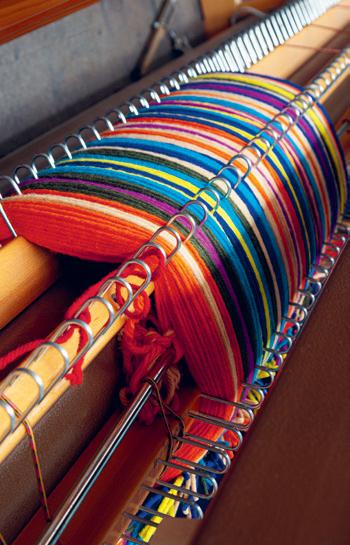 Auf ihrem ersten Webstuhl webt Isabel Bürgin heute vor allem Schals. Seit 2015 verfügt sie zusätzlich über einen drei Meter breiten Teppichwebstuhl mit zwei Schäften. An diesem sitzt die Weberin nicht, vielmehr geht sie unablässig vor dem Webstuhl hin und her. Auch wenn der Schaftwechsel mit Druckluft unterstützt wird – das Teppichweben bleibt eine körperlich anstrengende Arbeit. Die Weberin ist nicht gefeit vor Rückenbeschwerden. Fällt sie aus, so geht das ins Geld. Um ihren Rücken zu schonen, achtet sie darauf, zwischen stehenden und sitzenden Arbeiten in Webatelier und Büro abzuwechseln, regelmässig Pausen und Rückenübungen zu machen, in der Freizeit viel zu laufen, zu schwimmen.