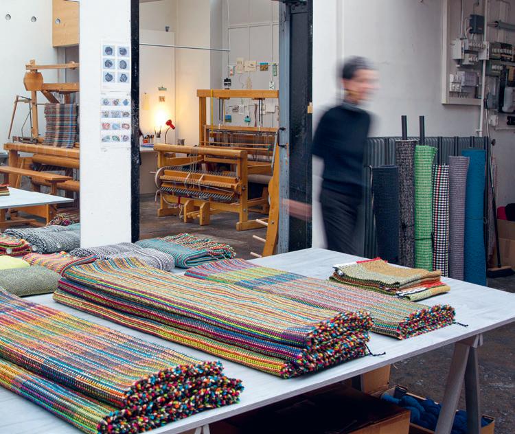Im Hof vor dem Atelier blühen Blumen und wachsen Kräuter. Drinnen, im Eingangsbereich, stehen Tisch und Stühle für Mittagessen, Pausen und Gespräche. In der angrenzenden klitzekleinen Küche kocht, wer an der Reihe ist. Die Weberin Isabel Bürgin und der Schreiner Hansueli Suter sind seit vierundzwanzig Jahren in der ehemaligen Zuckerbäckerei am Werk. Im kleineren der beiden anschliessenden Atelierräume arbeitet zurzeit eine junge weitere Weberin. In ihrem lang gezogenen, grossen Raum spürt Isabel Bürgin die Sonne, sie hört den Regen aufs Glasdach prasseln. Ihr Webatelier ist gleichzeitig Büro und Showroom. Jeweils am Freitagnachmittag sind Besucherinnen und Besucher willkommen : Sie können die übersichtlich ausgestellten, bunt leuchtenden Teppiche, Decken und Schals ansehen, anfassen, sich informieren. In einem Laden zu sitzen und auf Kundschaft zu warten, wäre nichts für Isabel Bürgin. Sie muss wirken, werken, sich bewegen können. « Ich bin eine Läuferin », sagt die agile Frau. Ihre täglichen Fussmärsche regen sie an. « Ein Geräusch, eine Farbkombination in den Kleidern einer Frau, die an mir vorbeiläuft, die Natur, Lichtstimmungen. Inspiration kann man nicht holen, dafür muss man offen sein. »