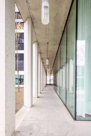 En prolongement conséquent de l’idée de base du bâtiment d’Adolf Krischanitz → p.122 , les secteurs de laboratoire ne sont même pas séparés par des vitres. Le rez- de - chaussée, avec 6 mètres de hauteur, offre de la place à un restaurant et une cafétéria. Le jardin sur le toit du dernier étage est constitué d’un grand bac en béton placé au centre. Il y pousse des arbres zelkova japonais, au milieu de près de 50 tonnes de billes de verre translucides vert : l’installation Molecular (Basel) de l’artiste Serge Spitzer.