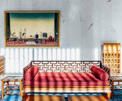 Une atmosphère d’opulence baroque est suscitée par le marbre de Carrare ajusté sans joints, les précieux bois d’if et d’olivier et les tapis bleu foncé.