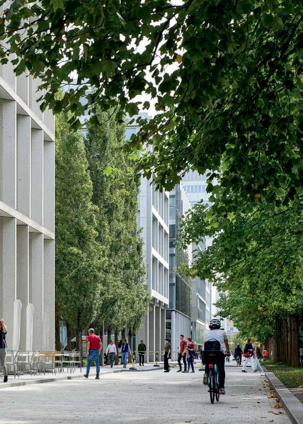 Avant 2001, il n’y avait que 18 arbres sur le site de Saint- Jean. La transformation du quartier coïncida avec une métamorphose fondamentale du monde du travail, accélérée par la numérisation. Le travail fut de plus en plus organisé de manière holistique et en ciblant le bien - être au quotidien. C’est avec cette arrière - pensée que furent planifiés les parcs et les jardins du Campus Novartis. Les espaces verts interrompent la densité de construction et créent des lieux ouverts où le personnel de l’entreprise peut profiter de la nature et se régénérer.
