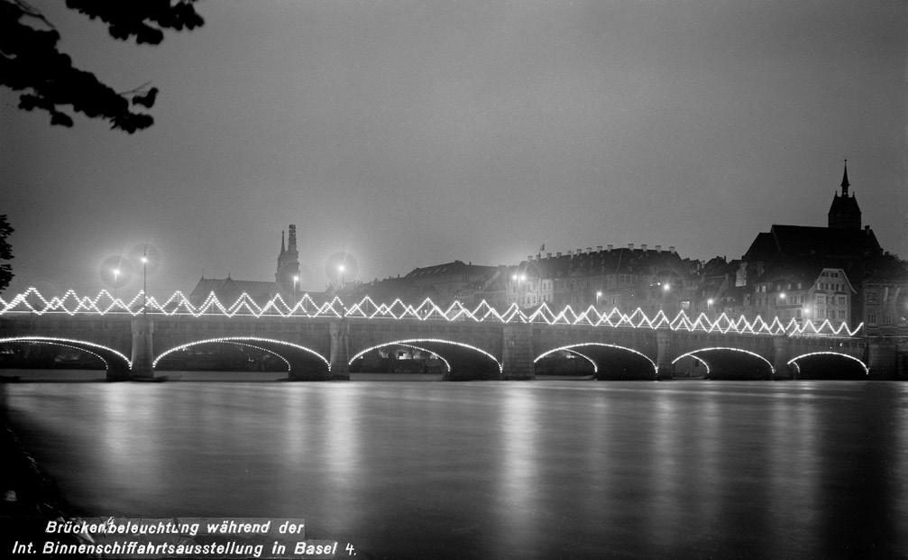 Lothar Jeck: Brückenbeleuchtung während der Internationalen Binnenschifffahrtsausstellung, Basel, 1926, Postkarte