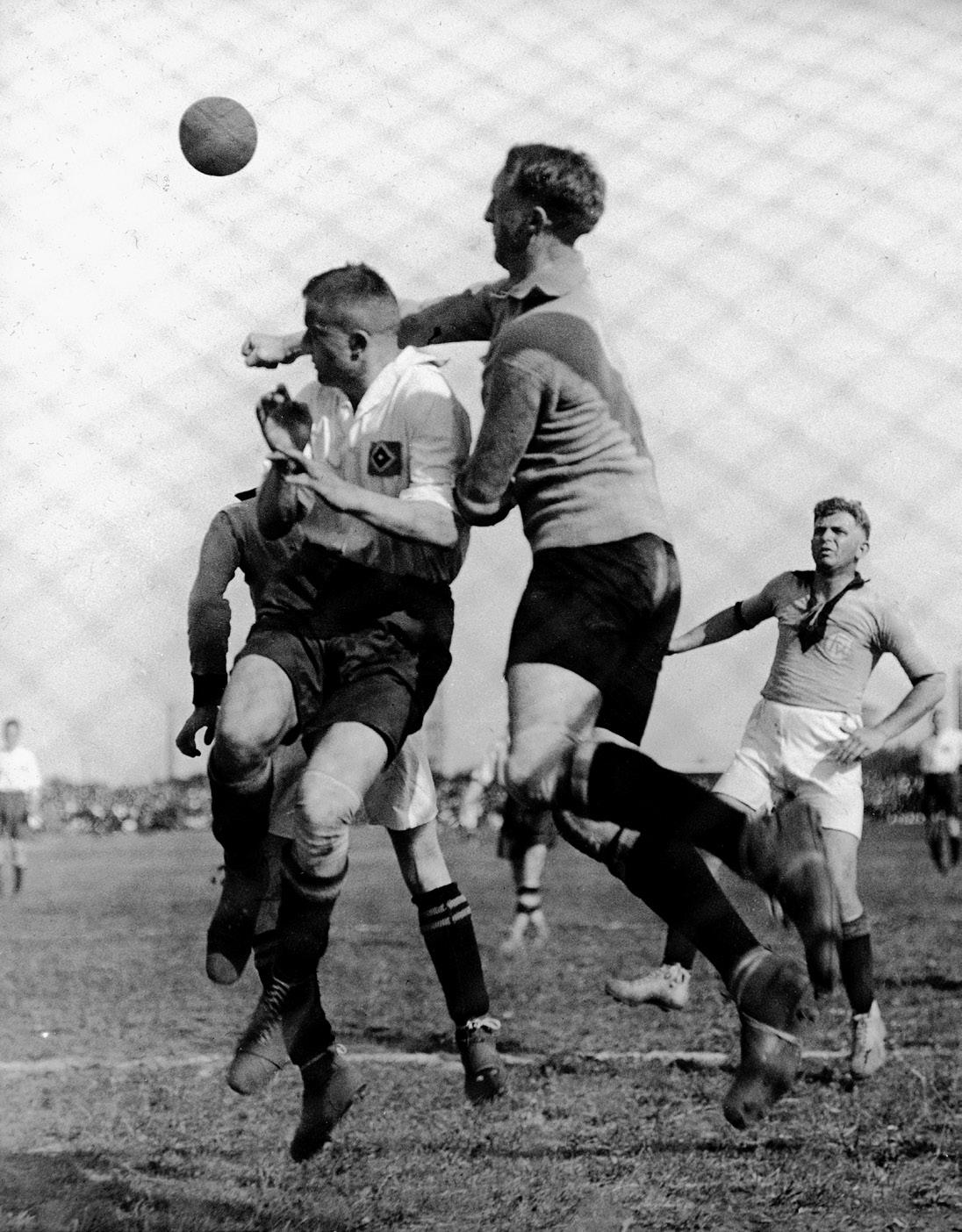 Als « ersten grossen Wurf » beschreibt Jeck in zwei Versionen die Aufnahme des Torwarts Walter Grunauer beim « Stadtrivalen-Match Sportclub Old-Boys gegen F.C. Basel » Abb. 05. Er habe sich sorgfältig vorbereitet und neben eines der Tore gesetzt, um den Zuschauern nicht die Sicht zu nehmen. Bei einem Elfmeter steht Jeck im Strafraum nahe dem Pfosten. Der Torwart springt dem Ball und der Kamera entgegen. Grunauer fliegt noch und ist unmittelbar davor, den Ball zu halten, als Jeck abdrückt: « Gleichzeitig knallte an meiner Leihkamera der Verschluss und die Aufnahme sass! Dieser Glücksfall war entscheidend für meine Zukunft. »35