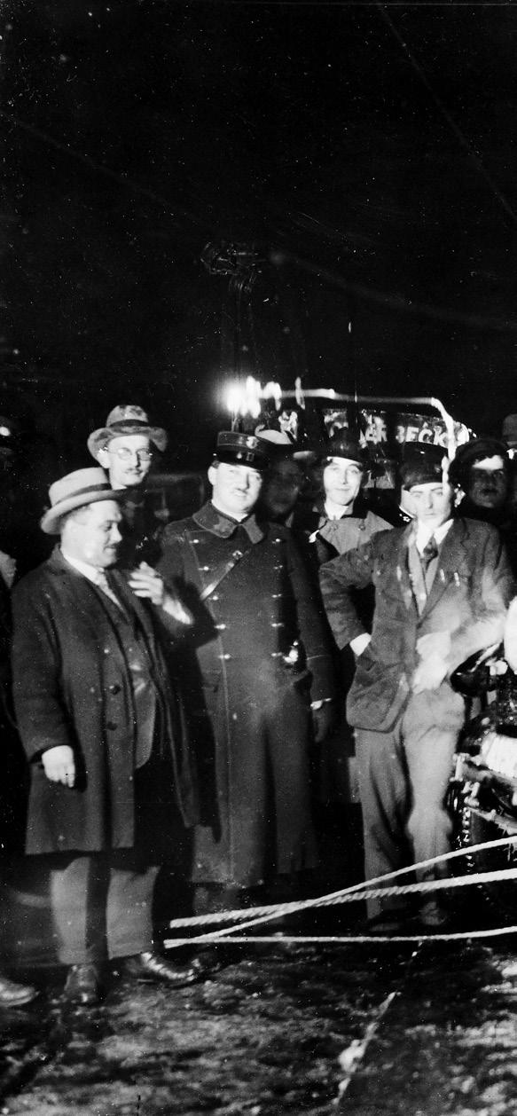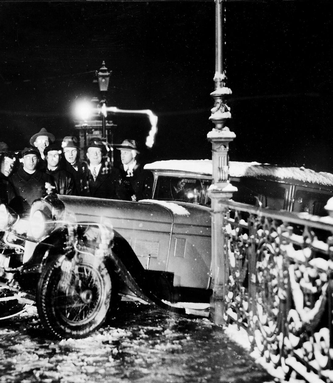 Es war am 13. Dezember 1927. Von einem befreundeten Journalisten erhielt ich nach Mitternacht den Tipp, ein Auto, mit vier Personen besetzt, hänge über dem Rhein. Er fand, es müsse doch möglich sein, dieses spektakuläre Ereignis mithilfe meines neuartigen Blitzapparats aufzunehmen. Also rasch in die Kleider, Stativ, Kamera, Platten, Blitzer und eine Taschenlampe zur Hand – und schon wartete ein Taxi, das mich zur Unfallstelle fuhr. Tatsächlich war ein Wagen infolge heftigen Regenund Schneefalls ins Schleudern geraten, hatte sich um die eigene Achse gedreht, das Geländer durchschlagen und war, mehrheitlich über dem Rhein hängend, zum Stillstand gekommen. Die hintere Wagentür konnte nicht mehr geöffnet werden. Passanten hielten das Auto fest, bis der letzte Insasse – unter sich den reissenden Fluss – über das schneebedeckte Trittbrett das rettende Brückentrottoir erreicht hatte. Nun kam also in dieser Situation meine Aufnahme. Ich hatte ja genügend Zeit und konnte in Ruhe die Kamera aufstellen und mithilfe der Taschenlampe die Schärfe regulieren (Die Strassenbeleuchtung war ja bereits ausgeschaltet!). Als ich schliesslich so weit war, fing es an, leicht zu schneien. Ich schüttete wie gewohnt das Pulver auf mein Gerät und öffnete das Objektiv. Aber alles blieb in Dunkel gehüllt, denn mein Pulver war bereits feucht geworden und zündete nicht mehr. Ich rief in die schaulustige Menge, ob jemand einen Schirm zur Hand hätte. ‹Nein›, erwiderte einer, ‹aber einen Hut!› Das war die Rettung. Ich blies das nasse Pulver in den Rhein und schüttete unter dem Schneeschutz der entliehenen Kopfbedeckung eine neue Ladung auf das Gerät und drückte wieder auf den Auslöser. Diesmal klappte es, und für eine Zeit lang sah man nur noch den grellen Schein des Blitzes vor Augen, bis man sich wieder an die Dunkelheit gewöhnt hatte. Man lernt nie aus. Also bei Schneefall Hut mitnehmen!»