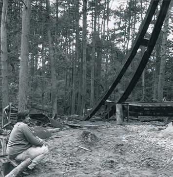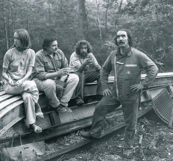 03 Auf den schweren Stahlträgern sitzen die engsten Mitarbeiter: Niki de Saint Phalle, Bernhard Luginbühl und Seppi Imhof (v.l.n.r.); Tinguely trägt seinen blauen Overall und bereits einen Schnurrbart. Das Foto von Leonardo Bezzola datiert aus den Anfangszeiten des Baus.