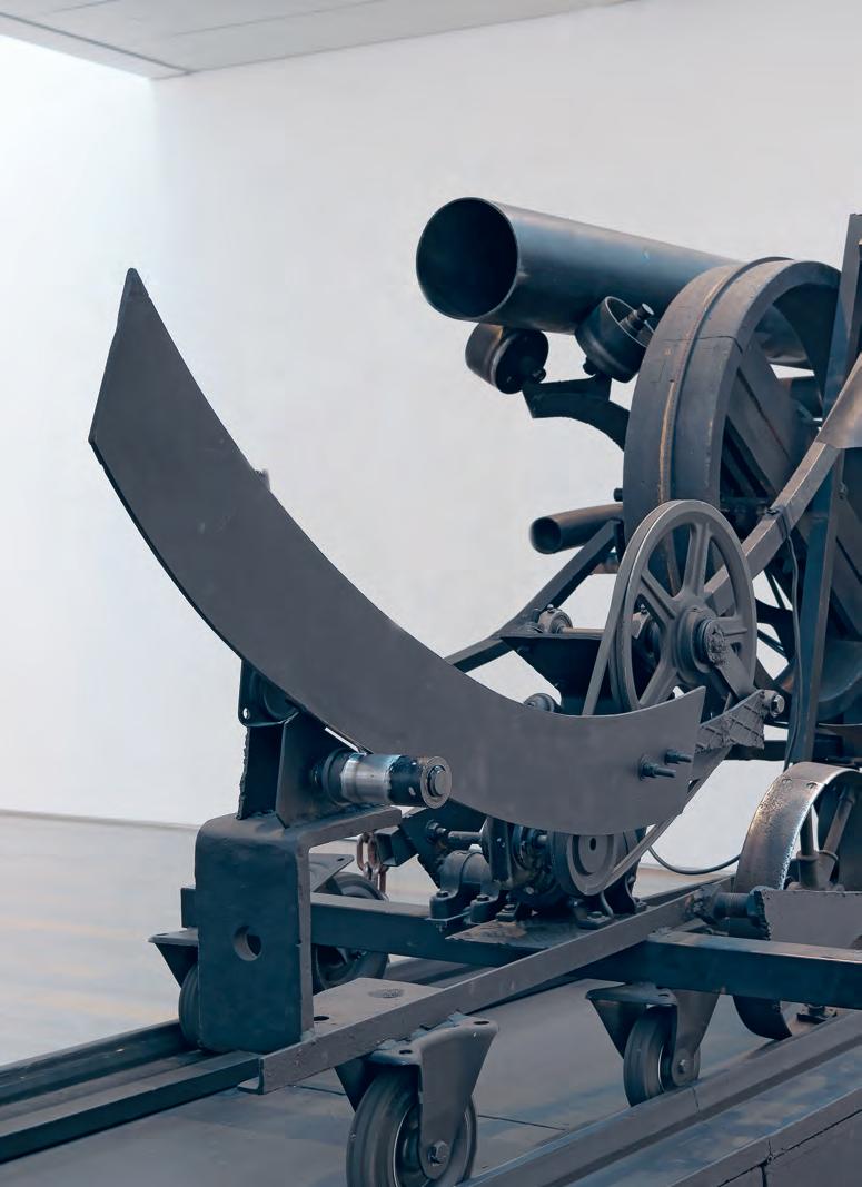 1967, 180 × 153 × 715 cm, auf Holzpodest mit Metallschienen, Holzund Metallräder, Metallröhren, Gummiriemen, Kette, alles schwarz bemalt, Elektromotoren, Basel Tourismus