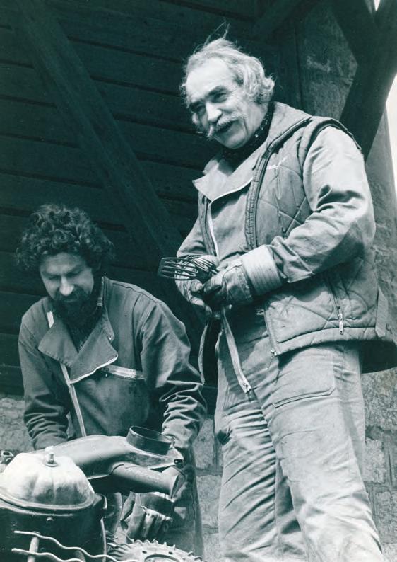 Seppi Imhof (l.) arbeitet ab 1970 als Assistent für Jean Tinguely. Vera Isler hat die beiden hier 1984 bei der Arbeit in Neyruz festgehalten, wo ein alter, umgebauter Gasthof Tinguely sowohl als Wohnhaus wie auch als Atelier diente.