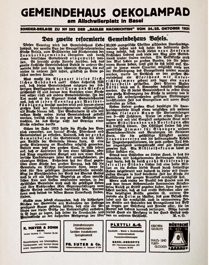Es waren krisenhafte Zeiten, als die Evangelisch-reformierte Kirche Basel-Stadt das Gemeindehaus Oekolampad am Allschwilerplatz in Basel baute und es 1931 als kirchliches Zentrum für das neu entstehende Quartier eröffnete. Die nationalsozialistische und die kommunistische Ideologie stellten die Religion infrage, und die Kirche war deshalb besorgt, wie die christliche Bevölkerung weiterhin seelsorgerisch betreut werden konnte.