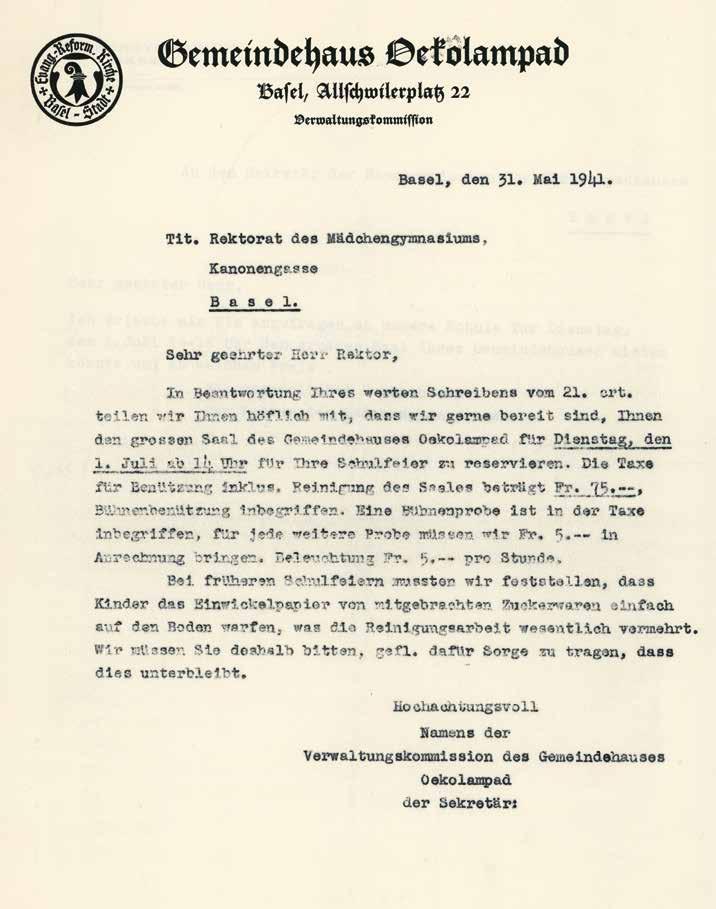 Brief der Verwaltungskommission des Gemeindehauses an das Rektorat der Mädchenschule, 1941