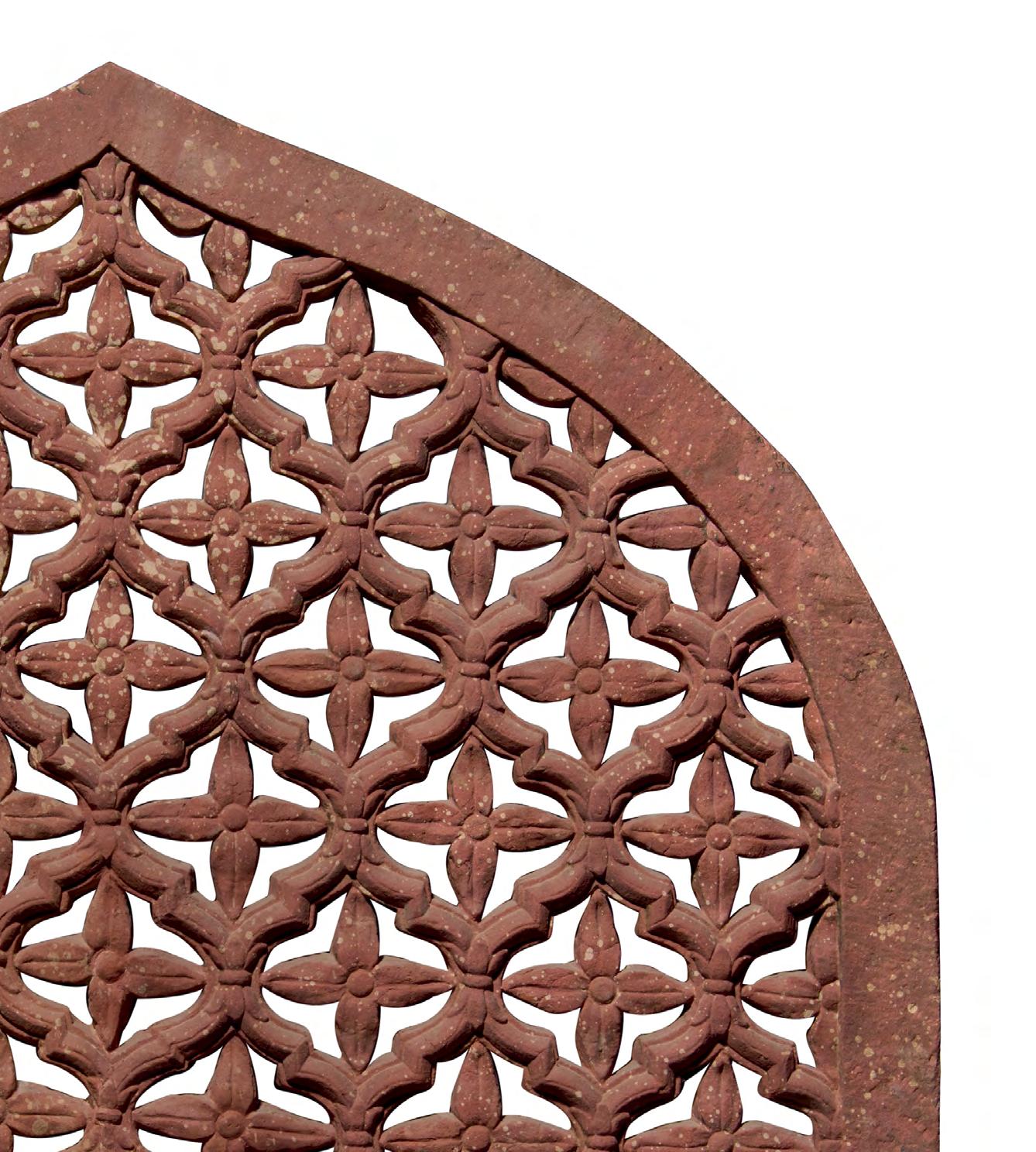 A carved and pierced double-sided red sandstone jali screen in the form of a pointed arch, the unusual and elaborate lattice design consisting of interlinked stepped quatrefoil ogival cartouches, each containing a four-petalled flower.