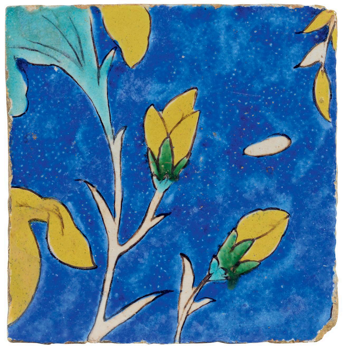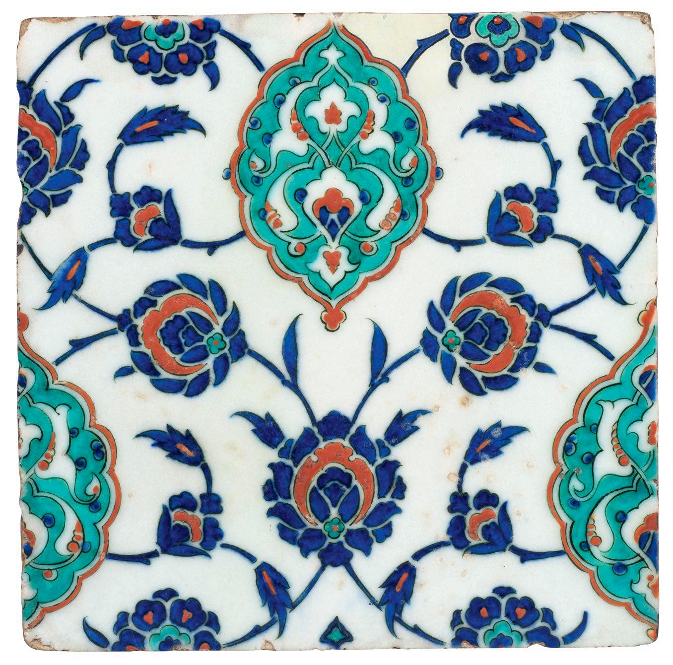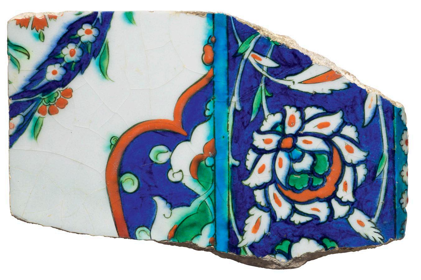 Other examples of this rare design can be seen in the Brooklyn Museum, New York (86.227.194); the Louvre Museum, Paris (MAO 311c); the Museum of Islamic Art, Doha (TI.59.1998); the David Collection, Copenhagen (28/1962); the Victoria and Albert Museum, London (908 to F-1894 and 894-1897); the Sadberk Hanim Museum, Istanbul; and the British Museum, London (Museum number: OA+.10676). An example of a similar tile in a different palette is published in Yanni Petsopoulos, Tulips, Arabesques and Turbans, 1982, no. 107.