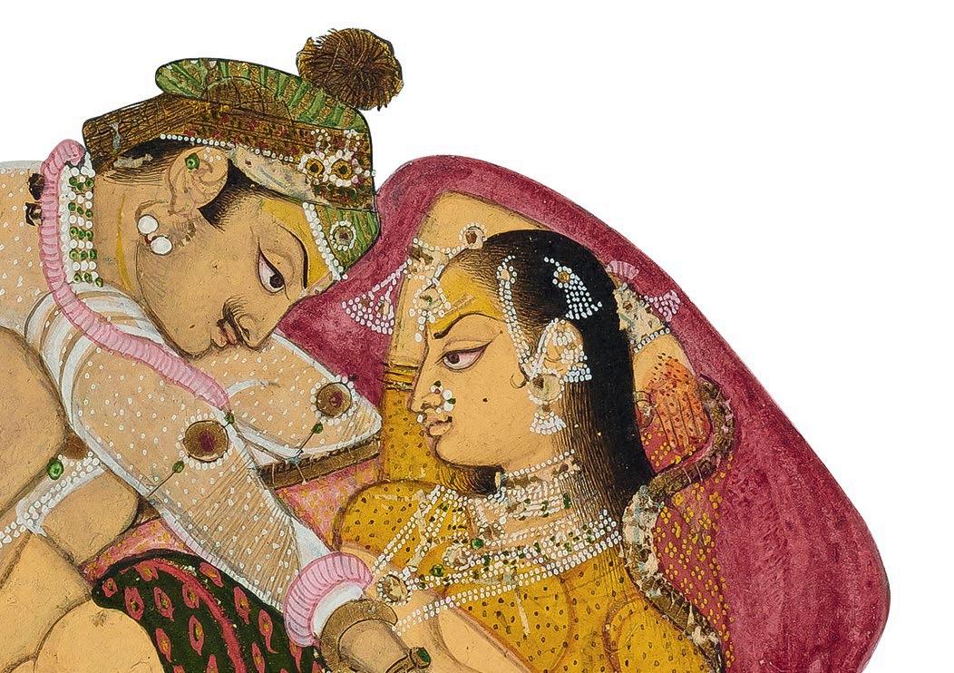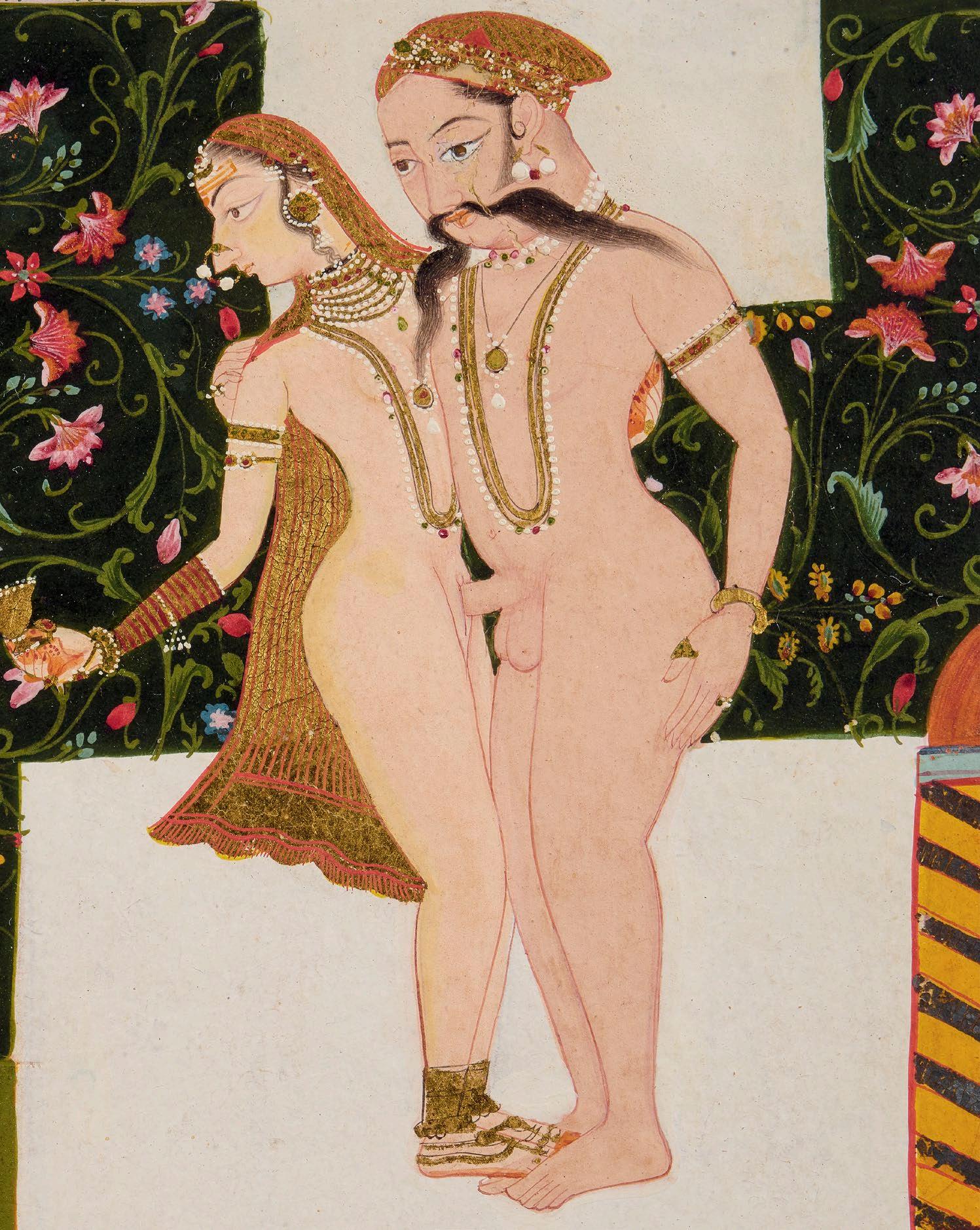 Leaning against a large orange bolster on a white coverlet placed on a yellow carpet decorated with floral sprigs, the prince pulls his consort ever closer towards his embrace and his arousal, his legs intertwined with hers and his right arm coiled around her neck while his lightly clenched palm signals the direction and the next stage of the dalliance.