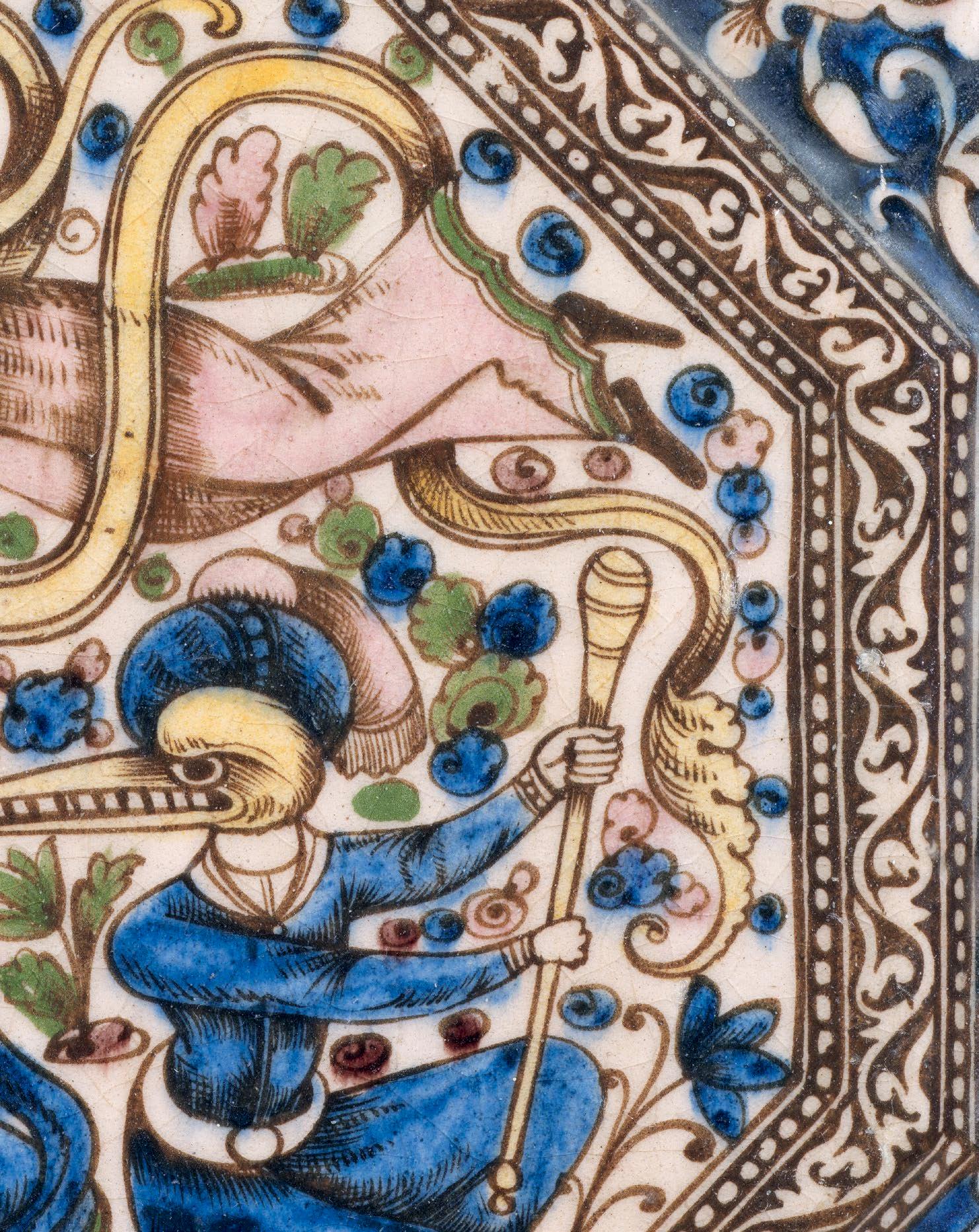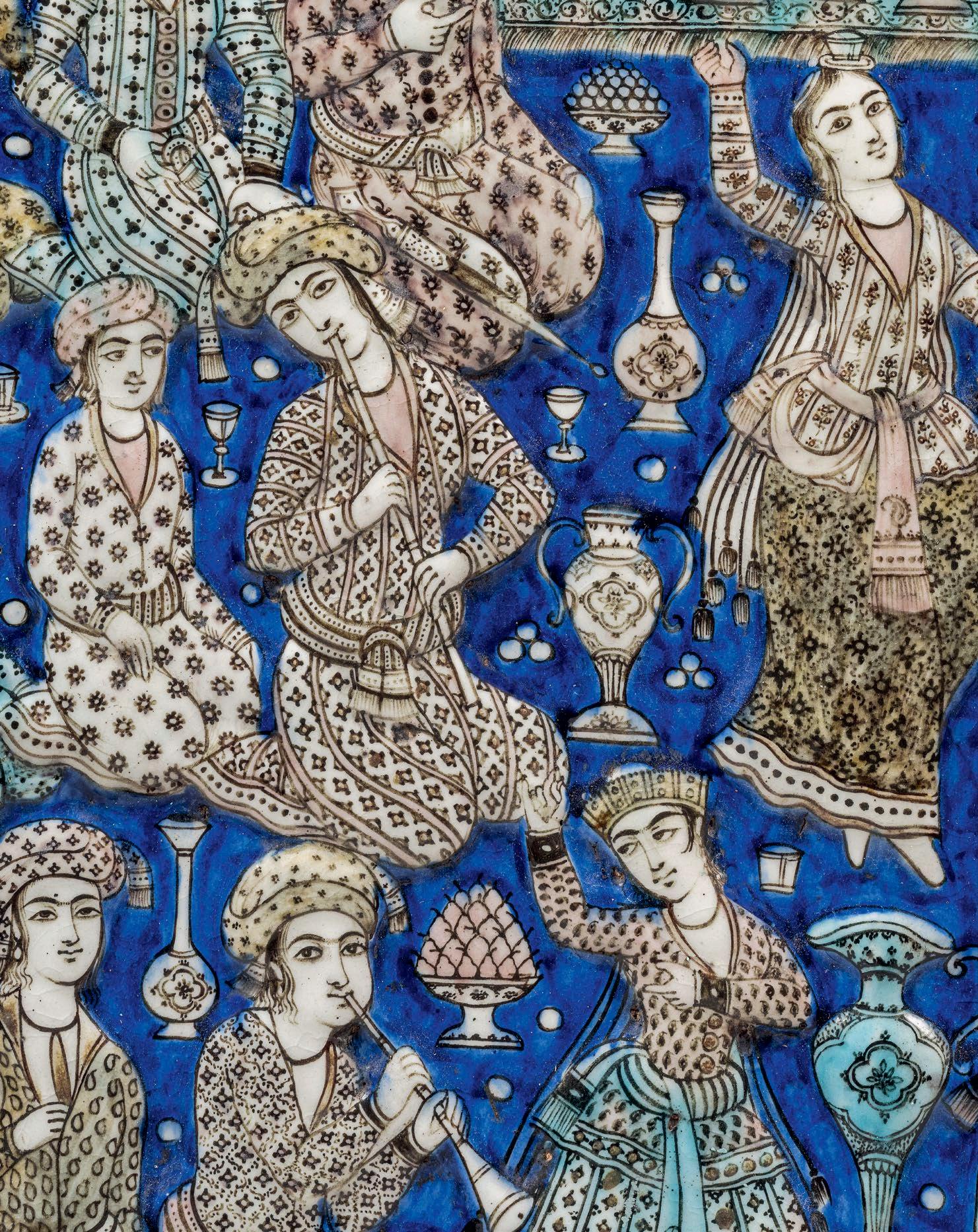 Some colours on various parts of the panel appear mottled, as can be seen on the brown tunic of the climber, as well as areas of sage green applied as clothing, rocks and apples. This is the result of an unusual technique that causes the glaze to pull apart when fired to create a sense of texture. The deliberate fracturing of the glaze may perhaps be due to a reaction between the oxides and the glaze. The lavender colour of the ground is also very unsual and rarely seen on Safavid tiles.