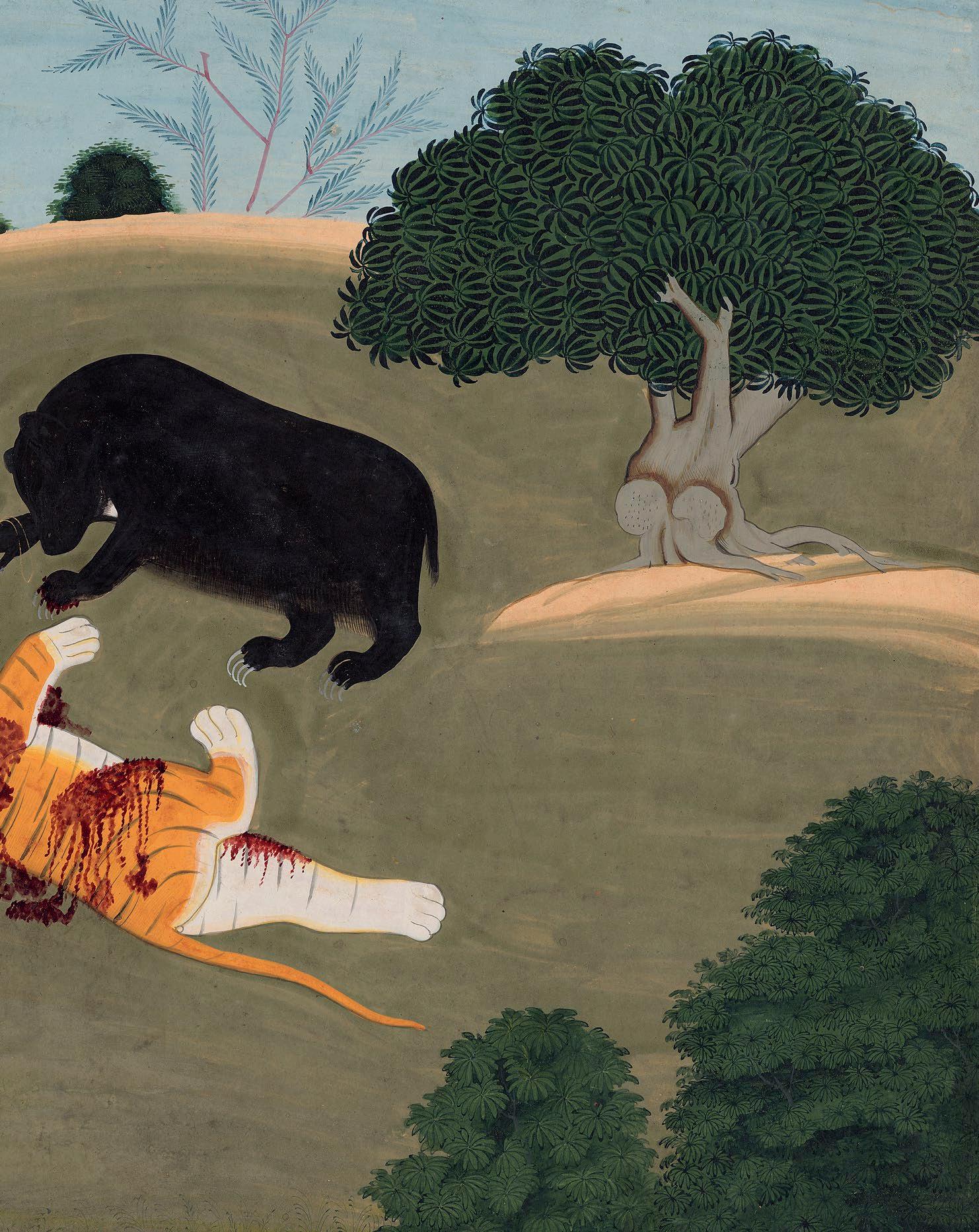 On the swell of a bleak plateau edged by forests, next to the tumbling rock formations of a steep mountain face sparsely dotted with moss and grass, Jambavan, the King of the Bears, has killed a lion and seized the Syamantaka jewel. The lion, depicted as often in Indian miniatures with stripes like a tiger (sher being the interchangeable name of the two great beasts), lies