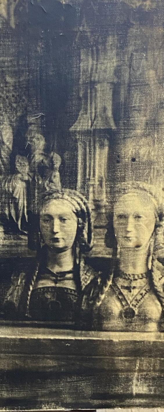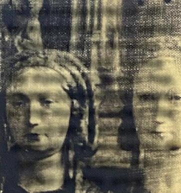 In Lank’s version, the martyr is rendered headless and fully clothed—a figure both present and absent, severed from classical formality and set instead in a landscape drawn from memory. The backdrop is a pastoral scene suggestive of the Hudson River School, but also of Saturday morning cartoons. Earthy tones meet comic surrealism. The familiar becomes uncanny.