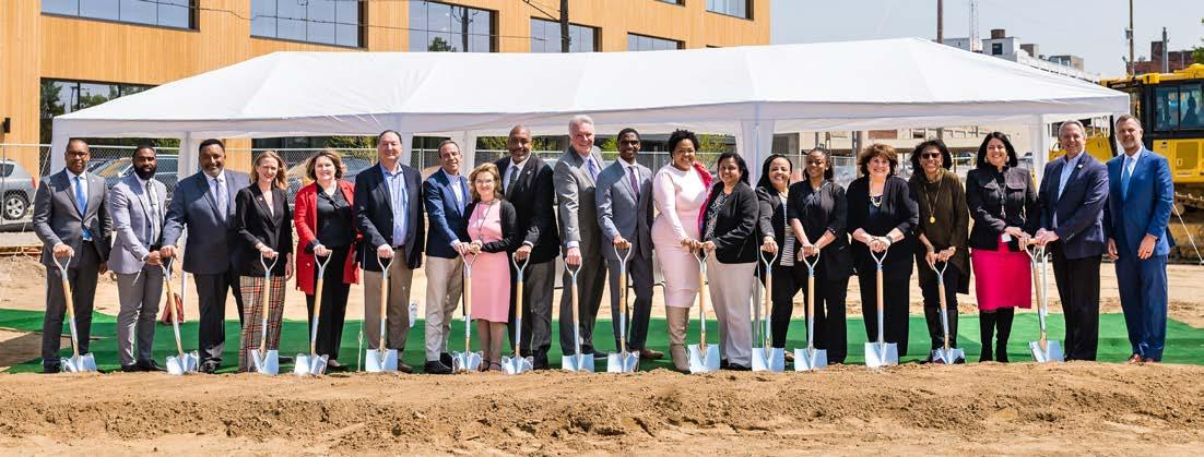 CIA President + CEO Kathryn J. Heidemann, fourth from left, joined officials from the City of Cleveland, Cuyahoga County, the Cleveland Foundation, Assembly for the Arts, University Hospitals, Case Western Reserve University, JumpStart, Hyland Software, Economic and Community Development Institute and more at the groundbreaking for the MidTown Collaboration Center—future home to CIA’s Interactive Media Lab—in Cleveland’s Hough neighborhood.