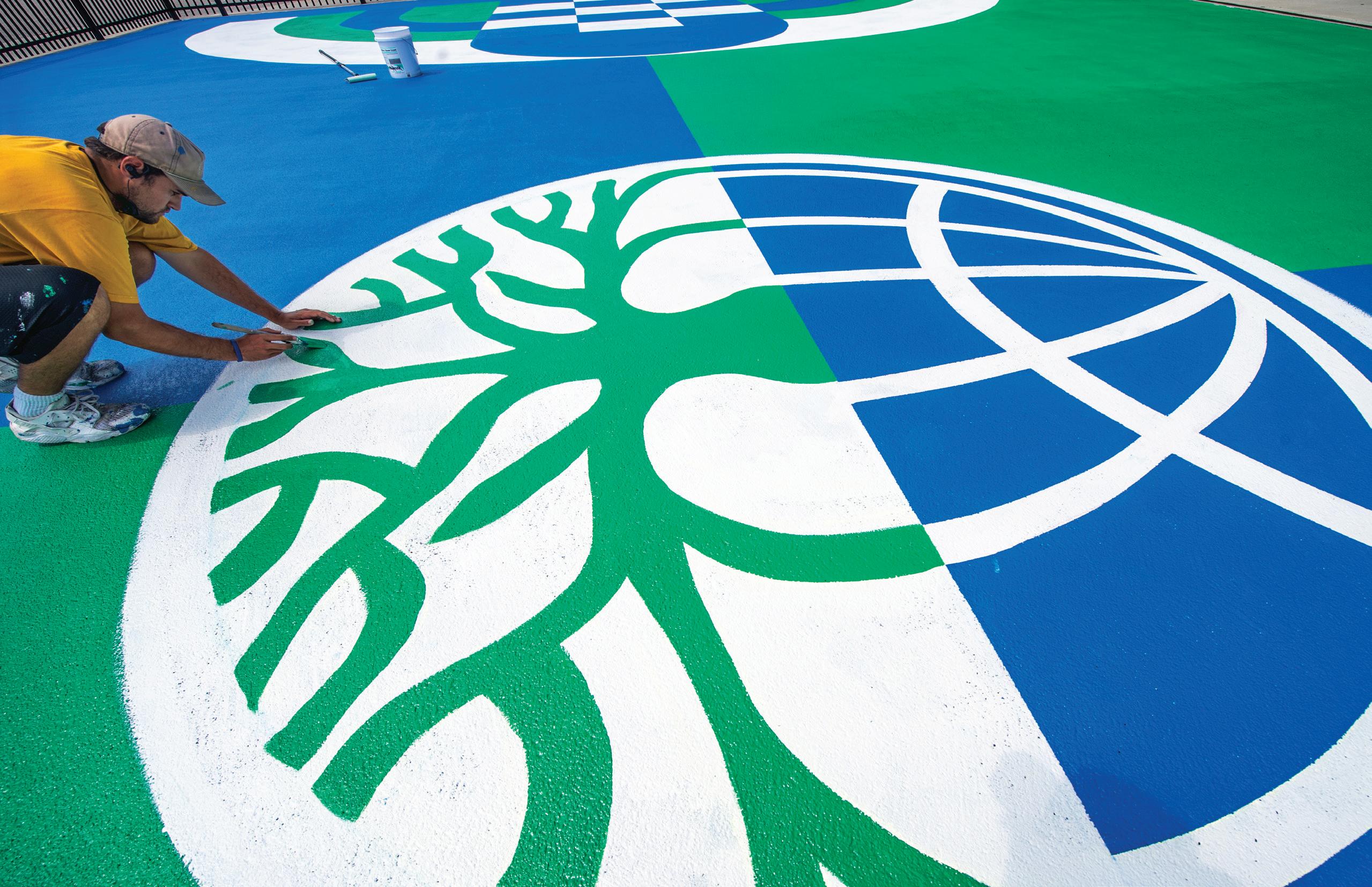 Birnie traces his love of mural work back to his days as a Drawing major at CIA. During a junior-year internship, he enlivened a basketball court at the Campus International School in Cleveland with a bold, customdesigned paint job.