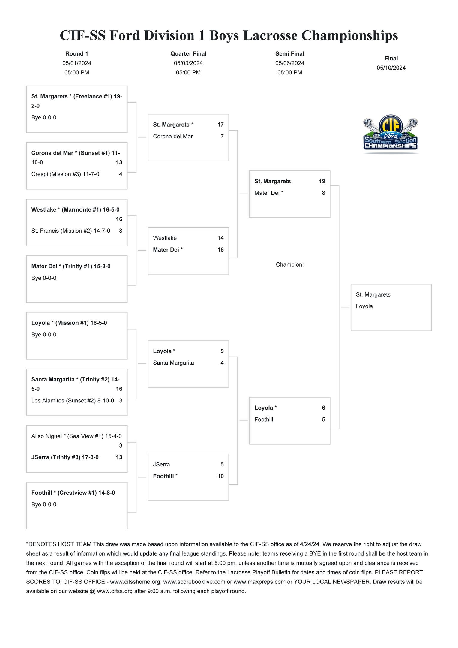 THE CIF SOUTHERN SECTION IS PROUD TO HOST THESE SECTION WIDE PLAYOFFS BASED ON THE HIGHEST LEVEL OF EDUCATION BASED ATHLETICS. WE HOPE THAT OUR EVENTS ARE MET WITH RESPECT, INTEGRITY AND DIGNITY FOR EVERY STUDENT ATHLETE, COACH, FAN BASE AND ESPECIALLY OUR GAME OFFICIALS. THIS WILL HELP PRODUCE THE HIGHEST LEVEL OF INTERSCHOLASTIC ATHLETIC EXPERIENCE FOR ALL INVOLVED.