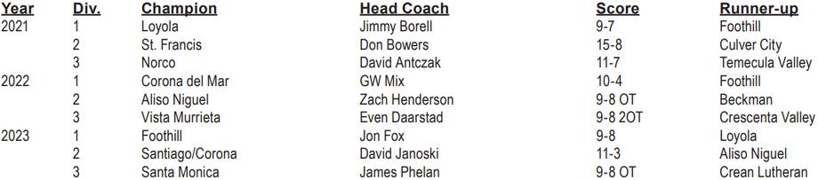 8 : 3 0 P M FRED K 6 : 0 0 P M LOYOLA MIRA COSTA* DIVISION 2 AGOURA VS 3 : 3 0 P M OAKS CHRISTIAN DIVISION 3 NOTRE DAME/SO* VS