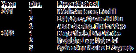 Christine Benitez Peter Kim & Paul Schilling Brent Ballard Scott Foster Pacific FFALCONS ALCONS Principal: Athletic Directors: Head Coach: Assistant Coach: League: DIVISION 2 SEA KINGS SEA KINGS Principal: Athletic Director: Head Coach: League: Trista Ramirez Brian Shapiro Todd Dearborn Bay No. 1 2 4 5 6 8 9 10 11 13 15 16 21 22 24 26 28 33 40 76 Name Camden Ballard Hannah Yi Audrey Chung Sophia Kachkeran Brianne Ballard Valentina Monzon Ashlyn Burton Chloe Schroeder Paige Mercer Jane Marriott Kate Fox Ashley Giboney Sophia Lima Shari Park Rachel Kim Kaylani Parker Isabella Torres Kaily Kim Ava Watson Kylie Atzert Yr. 10 10 11 12 12 11 12 11 12 12 12 10 10 12 11 10 11 10 12 10 Pos. M A A M M G M D D D D A M A D M G A D A No. 2 3 4 5 6 7 8 9 10 11 13 15 16 18 21 25 26 28 29 32 34 Name Naomi Gan Rachel Padian Sofia Schrader Stefi Prado Kylie Lazar Donya Ahmady Kallista Wang Emily Miramontes Sarah Park Riley Padian Riona Adachi Charlotte Pluimer Sydney Sidell Cami Michel Kyra Schmid Emily Heinze Charlotte Hoyne Grace Moore Cathryne Hawk Chloe Hartman Izzy Zaro Yr. 11 9 9 11 9 11 10 9 12 11 11 12 10 9 12 11 10 11 9 10 11 Pos. M M M D D D A A A M A D D M M A A G D A M