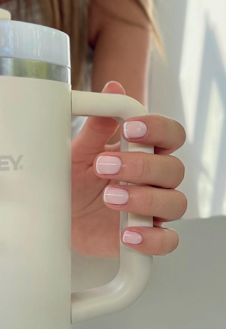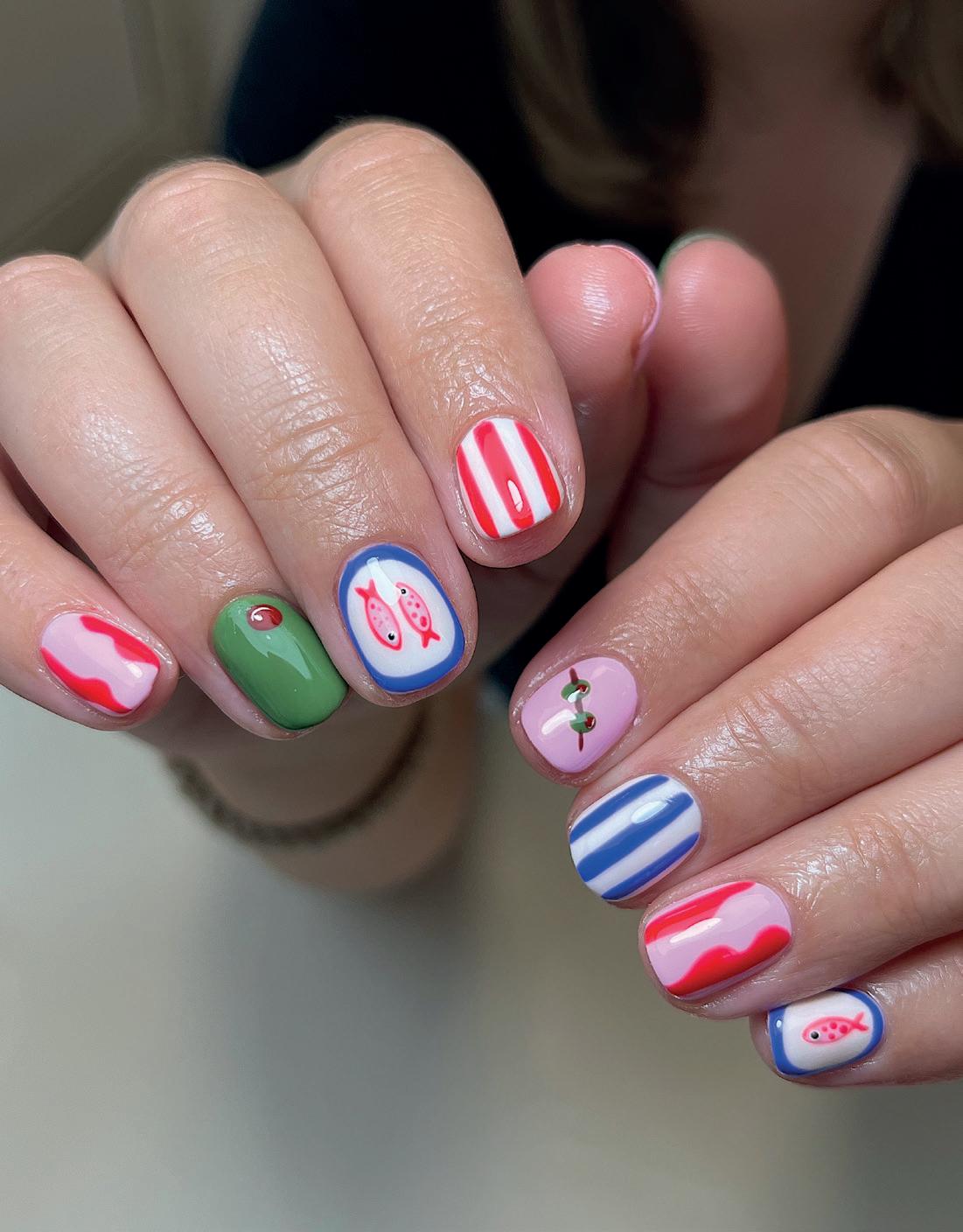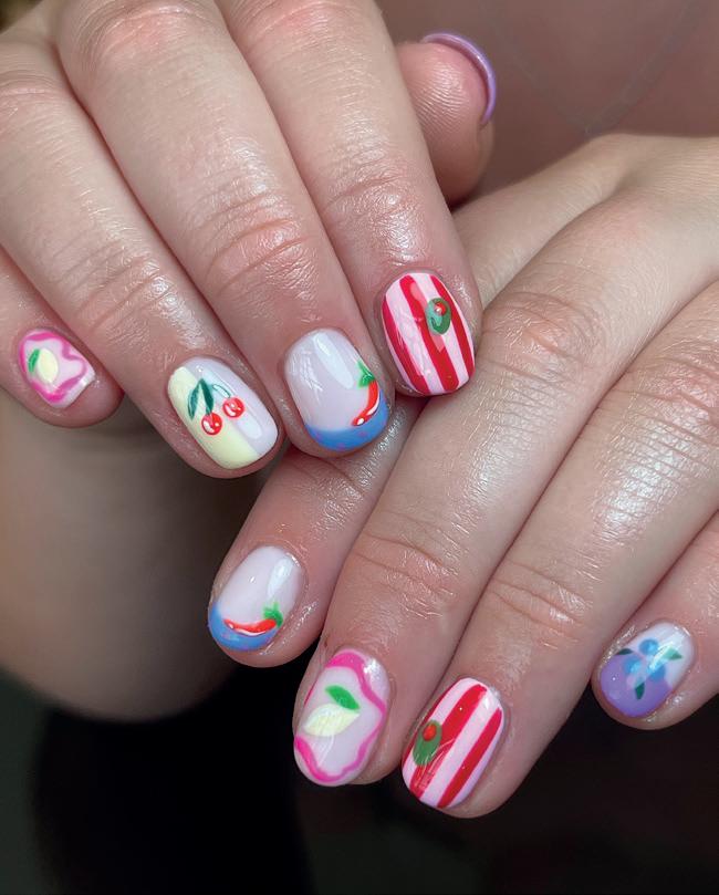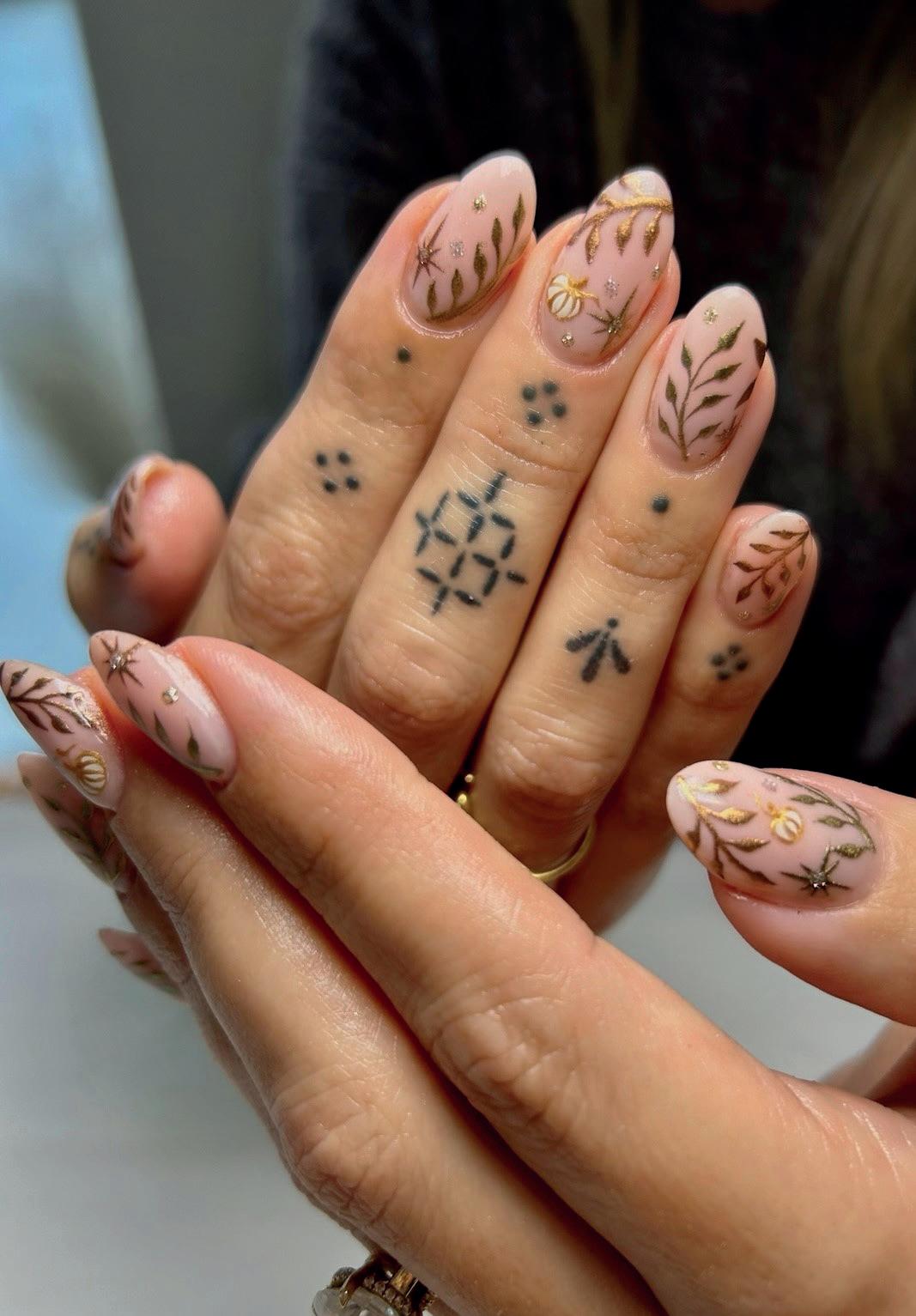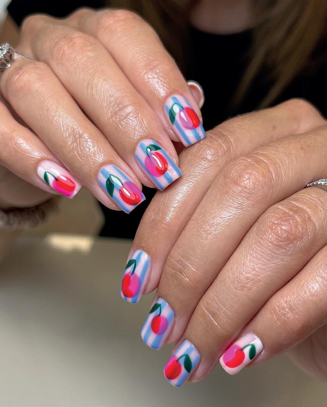 simplistic. I’ve absolutely loved the fish nails that have been super popular over the past few months – they’re so fun and colourful, which is exactly my vibe. On the flip side, I also love the spotty trend – a fun way to add nail art if you haven’t got a lot of time, which is key to having in your back pocket as a nail tech. As always for autumn and winter nails, I think chrome will continue to be mega popular, as that’s always a good look. But honestly I’m not very good at predicting trends, as I feel like one day there are none and the next day they’ve hit and everyone is obsessed – I don’t keep up very well, but luckily my clients don’t really go for trending nails either!