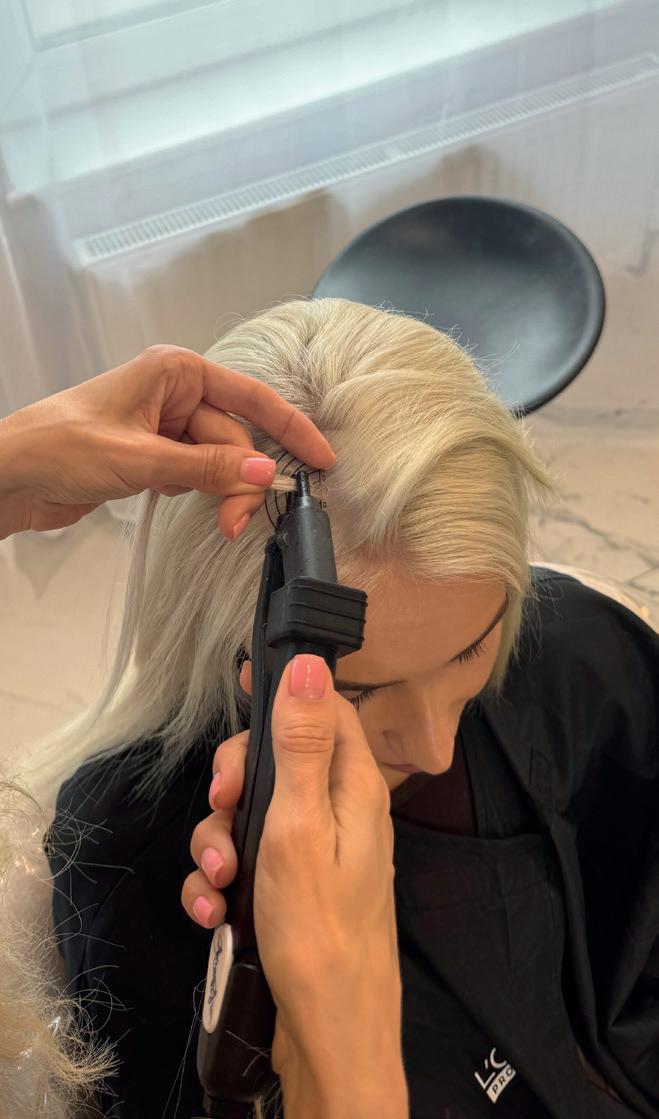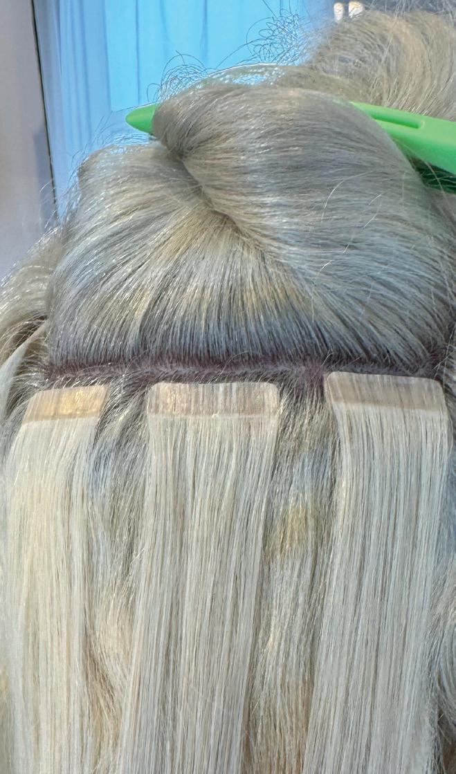 and discreet finish. That said, off-theshelf tapes often come oversized and rigid, especially unsuitable for clients with fine hair. That’s why Olia and the team developed Russian Mini Tapes, customdesigned to suit both fine and thick hair alike, ensuring comfort, quality, and an effortless natural blend.