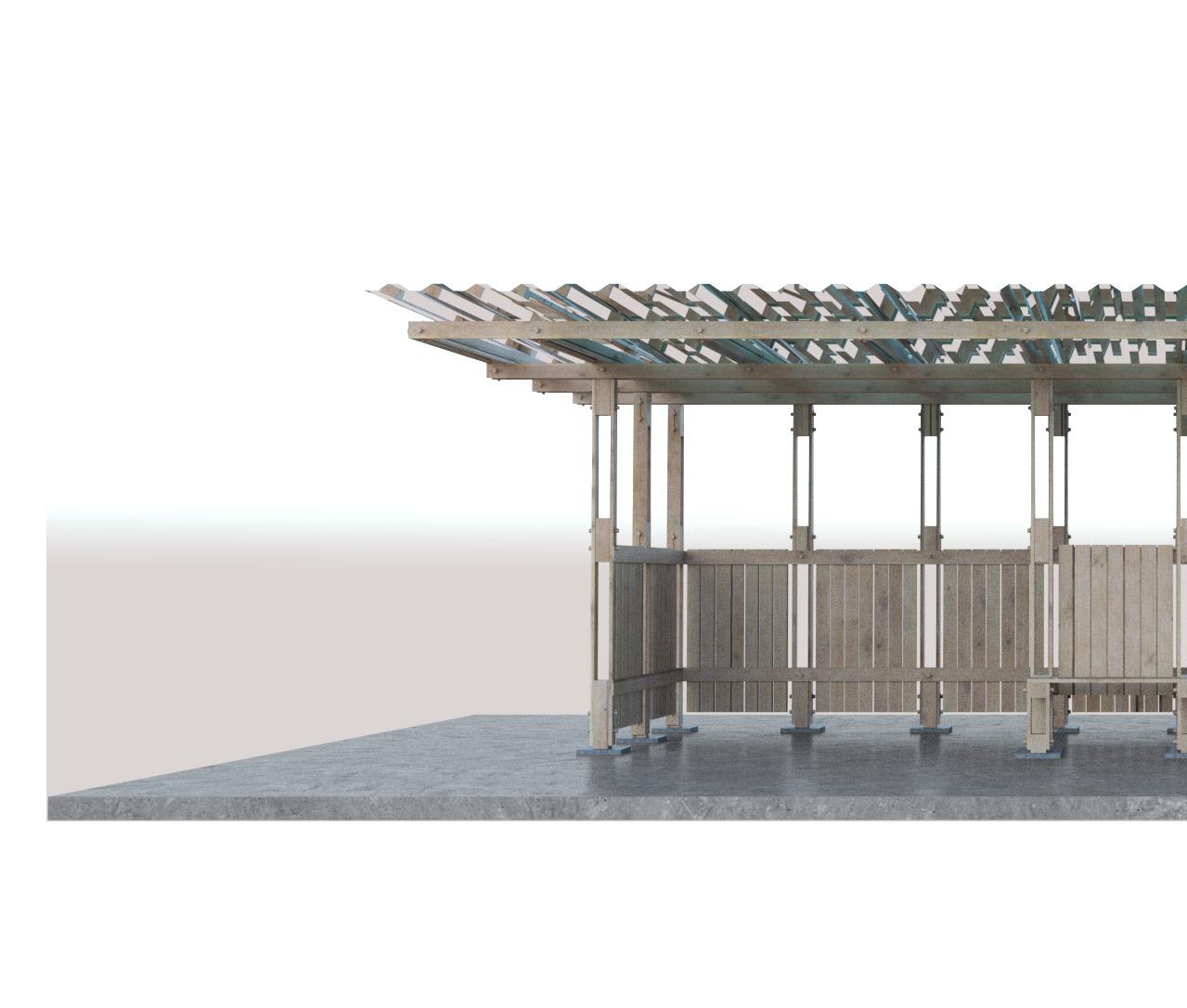 Vi har udviklet 4 forskellige forslag til, hvordan den tilpasningsdygtige trækonstruktion kan bruges i en arkitektonisk sammenhæng. Funktionen afhænger af, hvor den skal placeres. Samlet set har vi udformet en bænk, et skraldeskur, et cykelskur og en mindre pavillon.