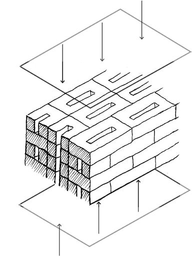 Opbygning og nedbrydning Støbe- og stampearbejdets motiver placerer sig i en tektonisk kategori, som Villy Ørskov har kaldt ’opbygning’ (i modsætning til ’nedbrydning’) , karakteriseret ved, at materialer og komponenter indgår i konstruktive relationer, hvori der ikke anvendes destruktive tilvirkningsprincipper (skære, bore, smelte osv.). Opbygning som konstruktionsprincip er velkendt, f.eks. i teglmurens stablingsprincip, hvor forbandtmønstre udgør vigtige motiver eller i forholdet mellem en tømmerkonstruktions spær og lægter, hvor dimensionering og takt er et bærende arkitektonisk motiv. Motiver baseret på opbygning er i reglen lette at aflæse. Mest tydeligt i så henseende er projektet ’Forvitringens æstetik’, der arbejder med et traditionelt murstensforbandt, men raffineret udfordrer selve murværksbegrebet, samt projektet ’Biokomposit’, der anvender små men markante fastholdelsesbeslag til montering af brandhæmmende beklædningsfliser.