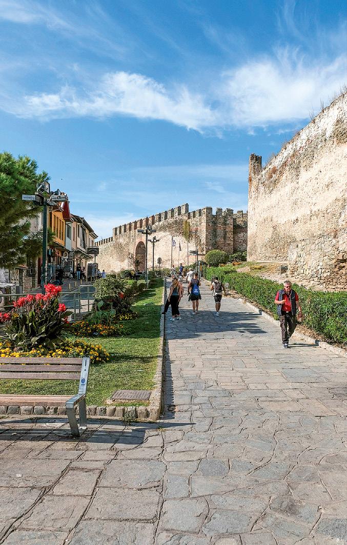 GR Σε αυτήν την περιοχή (που, όχι άδικα, αποκαλείται «το μπαλκόνι της Θεσσαλονίκης») θα ανακαλύψετε ένα άλλο πρόσωπο της πόλης, βγαλμένο από το παρελθόν, χωρίς την πυκνή δόμηση και τις πολυκατοικίες του κέντρου. Στη βόλτα σας θα περάσετε από γραφικές γειτονιές με μικρές μονοκατοικίες, αλλά και όμορφα αρχοντικά μακεδονίτικης αρχιτεκτονικής, αυλές γεμάτες λουλούδια, στενά καλντερίμια, δαιδαλώδη σοκάκια, πλατείες με παραδοσιακά καφέ και ταβερνάκια με νόστιμους, ντόπιους μεζέδες, που θα σας ταξιδέψουν πίσω στον χρόνο. Στο τέλος της διαδρομής σάς περιμένει η θέα του εκπληκτικού ηλιοβασιλέματος από ψηλά. Ξεκινώντας πάνω από την οδό Αγίου Δημητρίου, θα συναντήσετε στο διάβα σας σημαντικά μνημεία και εκκλησίες – ανάμεσά τους, μνημεία παγκόσμιας πολιτιστικής κληρονομιάς της UNESCO, όπως η εκκλησία της Αγίας Αικατερίνης, η μονή Βλατάδων, ο Άγιος Νικόλαος ο Ορφανός, ο Όσιος Δαυίδ, ο ναός των Ταξιαρχών, το Αλατζά Ιμαρέτ και το μαυσωλείο του Μουσά Μπαμπά. Σε όλη τη διαδρομή θα σας συντροφεύουν τα τείχη της Θεσσαλονίκης, τα οποία καταλήγουν, στο ψηλότερο σημείο της πόλης, στο Επταπύργιο (ή Γεντί Κουλέ, όπως ήταν το οθωμανικό του όνομα), στο βορειοανατολικό άκρο της ακρόπολης, και ο πύργος του Τριγωνίου, ο οποίος προσφέρει, κατά πολλούς, την καλύτερη, την πλέον πανοραμική θέα στη Θεσσαλονίκη και τον Θερμαϊκό κόλπο.
