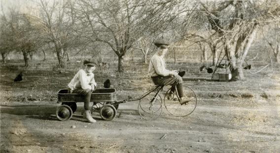 Bobby Maughan and Jack Trezise (Junior) playing in the family orchard. Continued overleaf