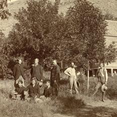 The Easley family’s “Orchard House” in Golden, about 1890. Standing in the center in the dark suit is Elwood Easley. His brother Rees Easley (with beard) is standing to the right. The young men on the left are believed to be their sons.
