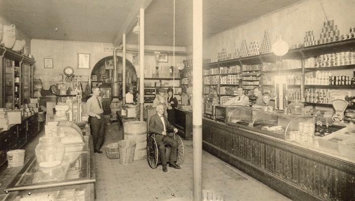 and storied past. Erected in 1892, the first business to occupy it was the E.E. Stewart Grocery Store. Exterior photographs of buildings are quite common, but interior shots tend to be far more scarce. In this image, Elvyn E. Stewart, the store’s namesake and founder sits in a wheelchair near the center. Behind the counter are two of Elvyn’s five sons, Harold and Frank, along with Burt Stewart, who might be one of his grandsons. The other people in the photo are unidentified.