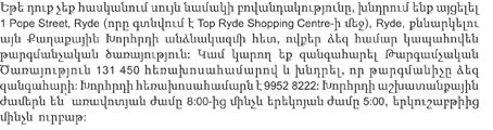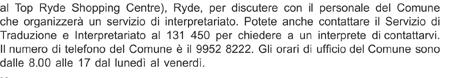 If you do not understand this document, please come to 1 Pope Street, Ryde (within Top Ryde Shopping Centre), to discuss it with Council staff, who will arrange an interpreter service. Or you may ring the Translating and Interpreting Service on 131 450 to ask an interpreter to contact you. Council’s phone number is 9952 8222. Council office hours are 8.00am to 5.00pm, Monday to Friday.