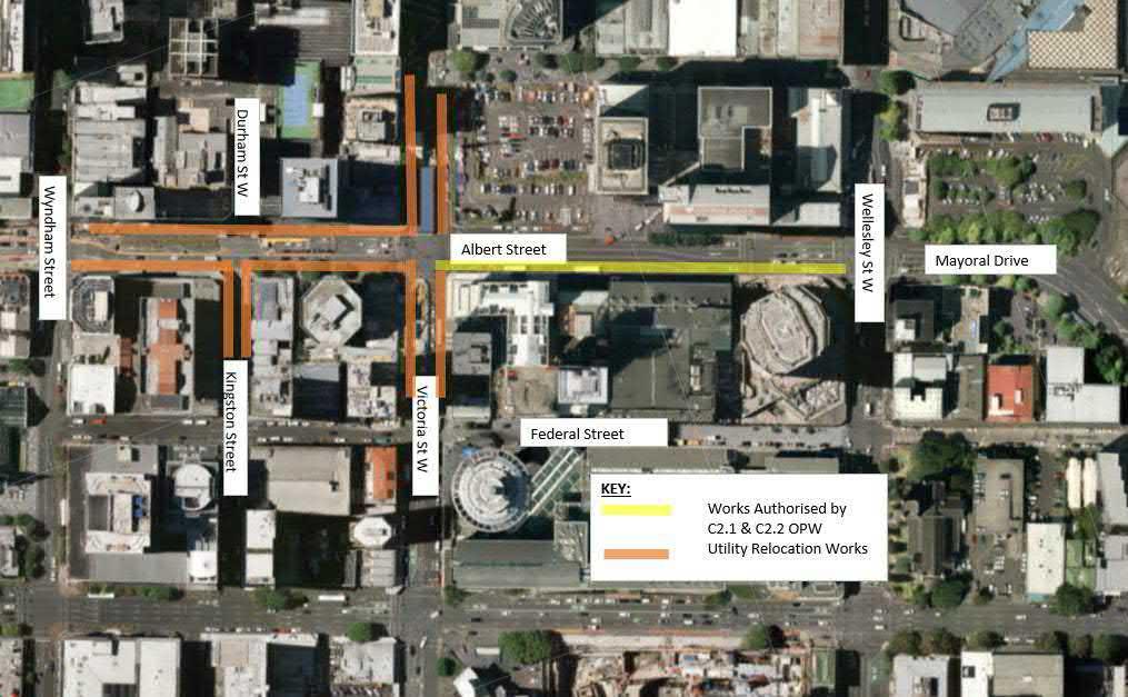 Briefly, the area of Aotea utility relocation works will generally be along Albert Street, from Wyndham Street to Wellesley Street, with works extending into parts of Kingston Street and Victoria Street. The works are to be broken down into three stages.