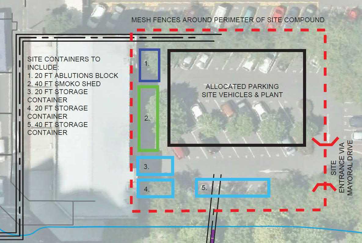A temporary construction site compound (Figure 3: Indicative layout of the Stage 2 Site Compound) will be formed on the corner of Wellesley Street and Mayoral Drive in the part of the Bledisloe House car park. This compound will be within the project designation boundary and will be established approximately from October 2019 (Stage 2), until March 2020. This site compound will be occupied by storage containers, the objective of the site compound is to provide a site that can be used as a rest area for workforce staff, and house equipment and vehicles during the works. Temporary fencing will be used to delineate the site, along with Link Alliance branded mesh scrim. Vehicle access will be via the existing entrance off Mayoral Drive and through the gate as marked on the plan. Containers are likely to include machinery equipment and a total of up to 1,200L (6x 20L drums) of diesel in bunds.