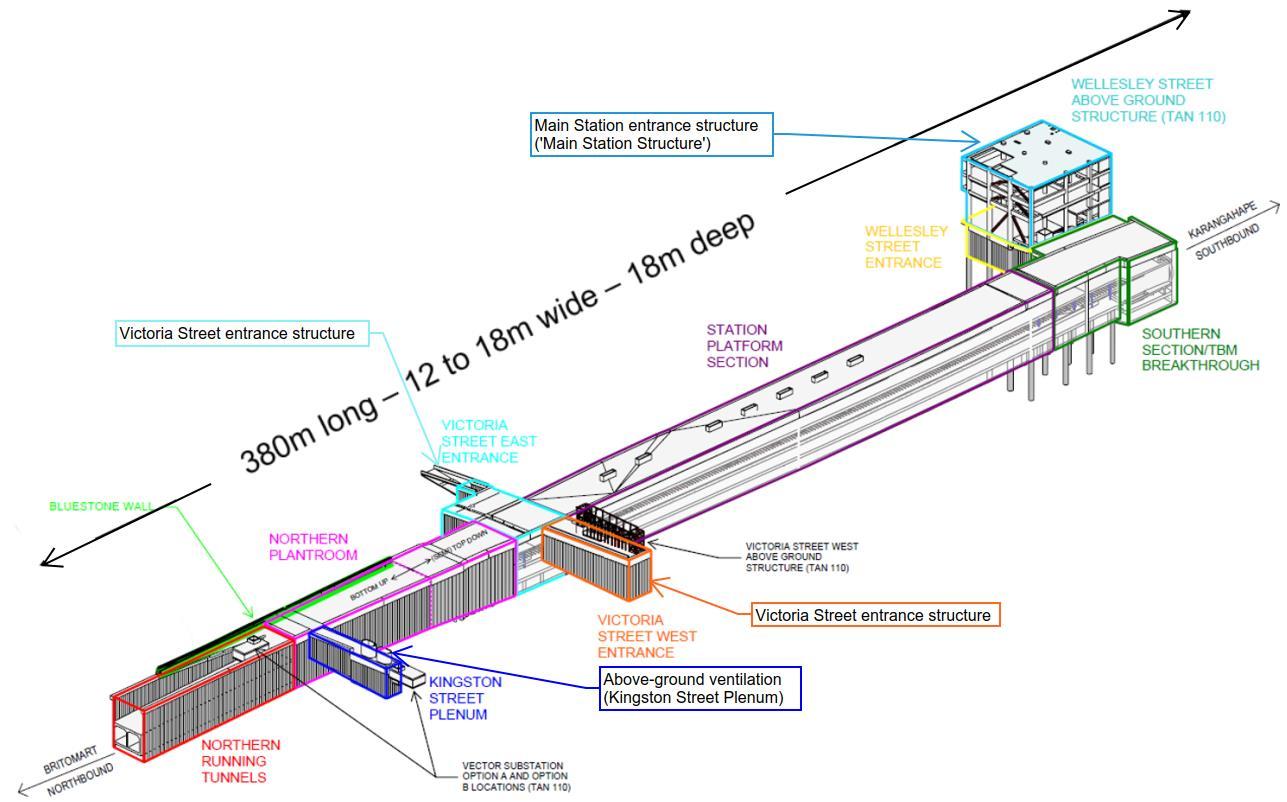 Once completed, the Aotea Station will include platforms, lifts, escalators, rooms for housing stations and tunnel services equipment, an entrance building at Wellesley Street, two additional entrance buildings at Victoria Street, a Plenum at Kingston Street, services, internal and architectural finishings, structural fittings, utilities services diversions and connections.