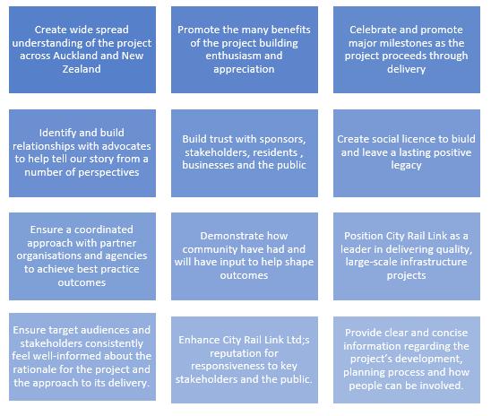 15.1 The objective of the Communication and Consultation Plan is to set out a framework to ensure appropriate communication and consultation is undertaken with the community, stakeholders, affected parties and affected in proximity parties during the construction of the City Rail Link. This document