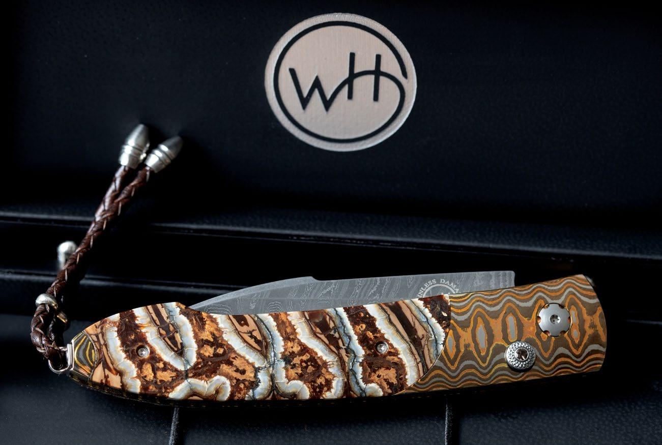 The Bolt “Mammut” knife from William Henry features handforaged Damascus steel, a piece of a 10,000-year-old fossilized wooly mammoth tooth, a onehand button lock, and smoky quartz gemstones, sure to impress any collector.