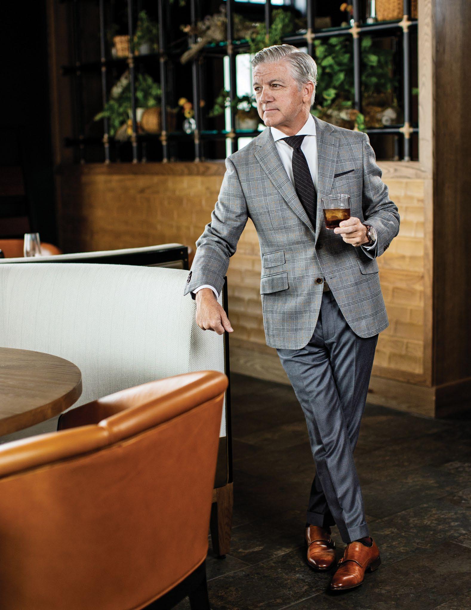 Tom James Company: Shirt, waistcoat, and Holland & Sherry sport coat by Tom James. 34 Heritage trousers. Johnston & Murphy shoes.