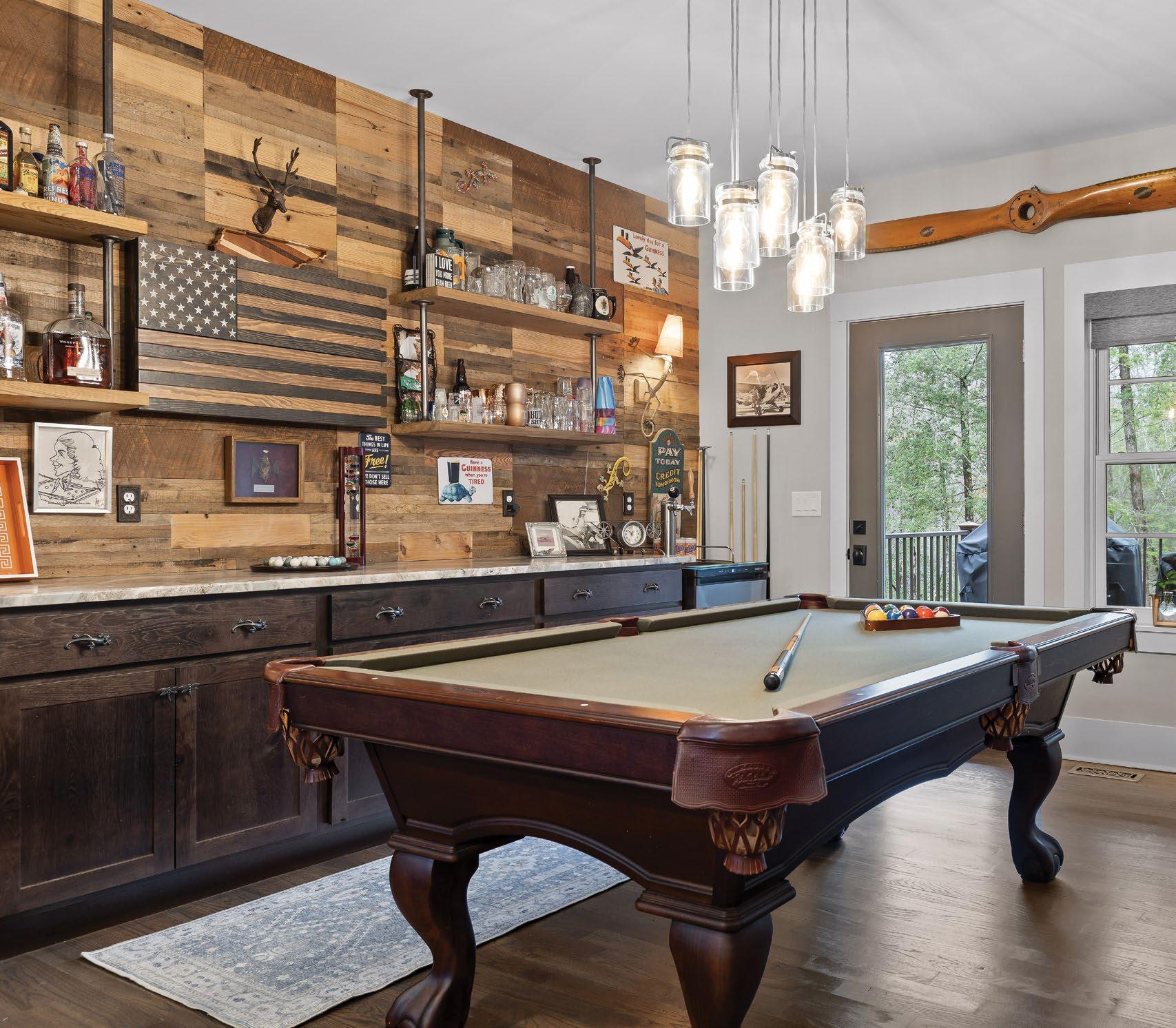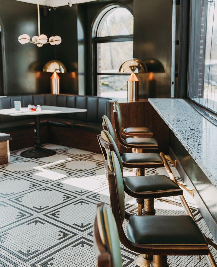 From wall to wall, the Ooltewah Whistlestop immerses guests in a nostalgic design reminiscent of a mid-century diner. Brassy light fixtures punctuate a row of booths, while barstools at a garage-style window provide front-row seats to the trains rolling by. On the hike up to the rooftop patio, guests on the stairwell can view a gallery wall of vintage photos from bygone days.