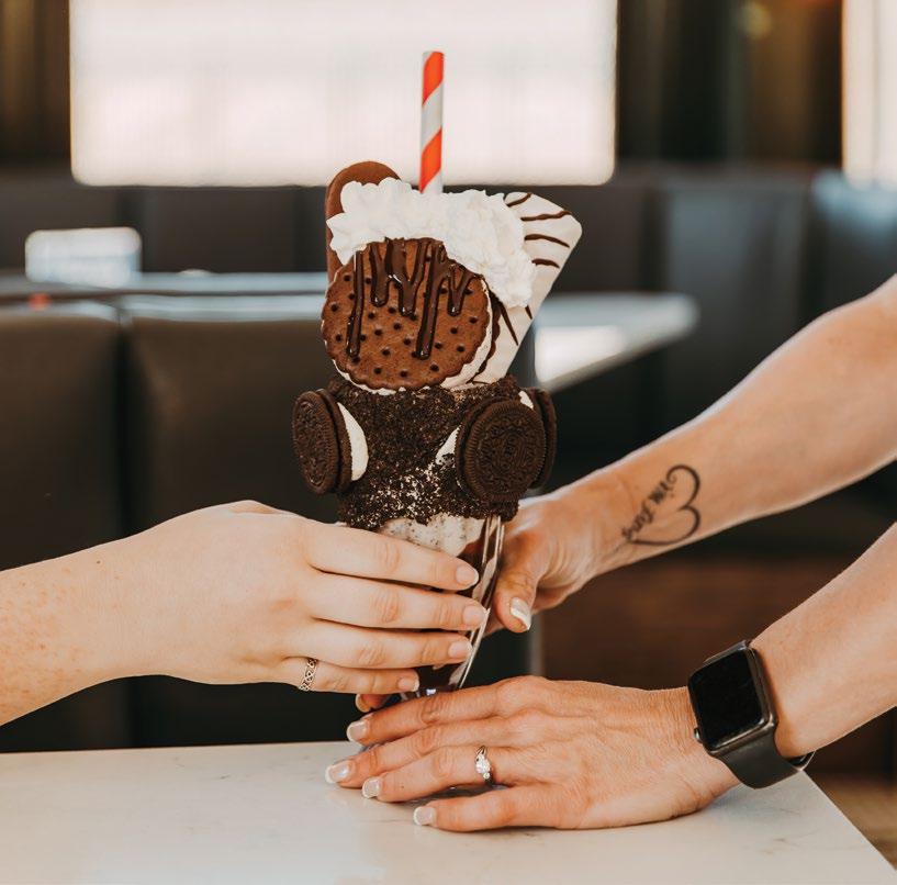If guests have saved room for dessert, they’re in for signature milkshakes piled high with candy, snack cakes, Tasty Donuts, whipped cream, and even whole slices of cake. These larger-than-life creations are a feat of engineering, winning the awe and delight of customers of all ages. Specialty milkshakes rotate throughout the seasons, including concoctions inspired by Shark Week, the U.S. Open, and the “Harry Potter” franchise. For folks who prefer to keep it classic, there are malts, floats, and even a “Boogie Woogie Bugle Boy Banana Split.”