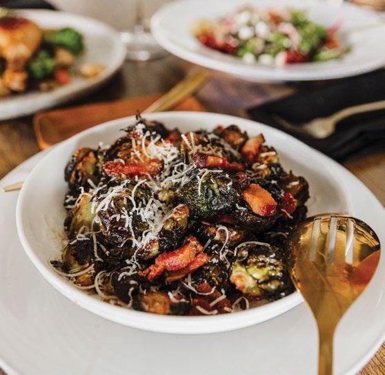 (left to right) Lemon-Vinaigrette Octopus Salad Tender sous vide Old Bay octopus, seared to perfection and paired with creamy feta, tangy pickled red onions, and zesty lemon vinaigrette. Butter-Braised Sous Vide Chicken Quartered chicken, sous vide and butter-braised, served over tangy pickled cannellini beans with herb-roasted broccoli and tender heirloom baby carrots. Crispy Brussels Sprouts Golden, crispy Brussels sprouts drizzled with honey and balsamic, seasoned with a house blend and topped with shaved Parmigiano Reggiano and smoky hog jowl lardons.